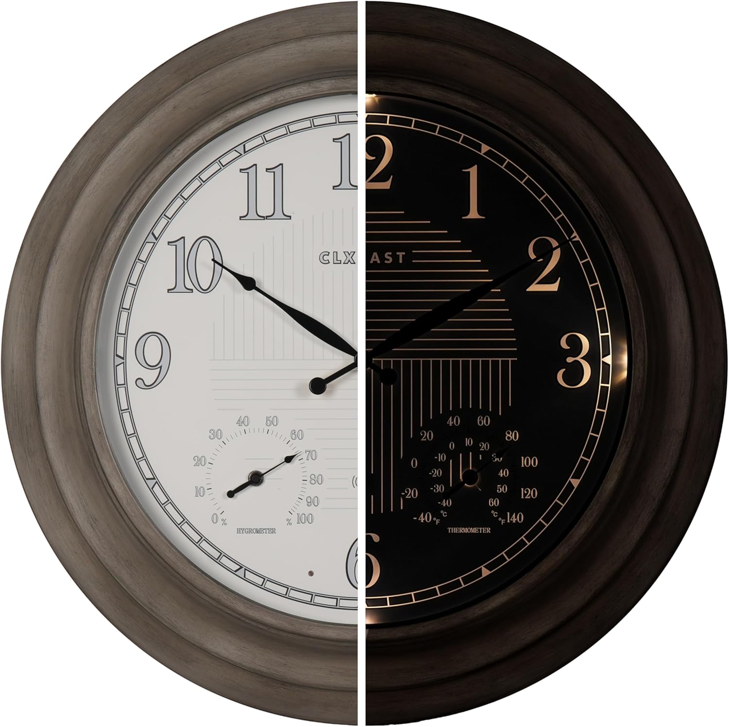 - [Outdoor Atomic Clock with Smart LED Light Sensor Technology]-This unique oversized 24" large outdoor metal wall clock is with integrated light sensor that automatically activates a warm, ambient dial backlight during dark conditions,shuts off in normal daylight 2 Backlight Modes - Always On, Always Off