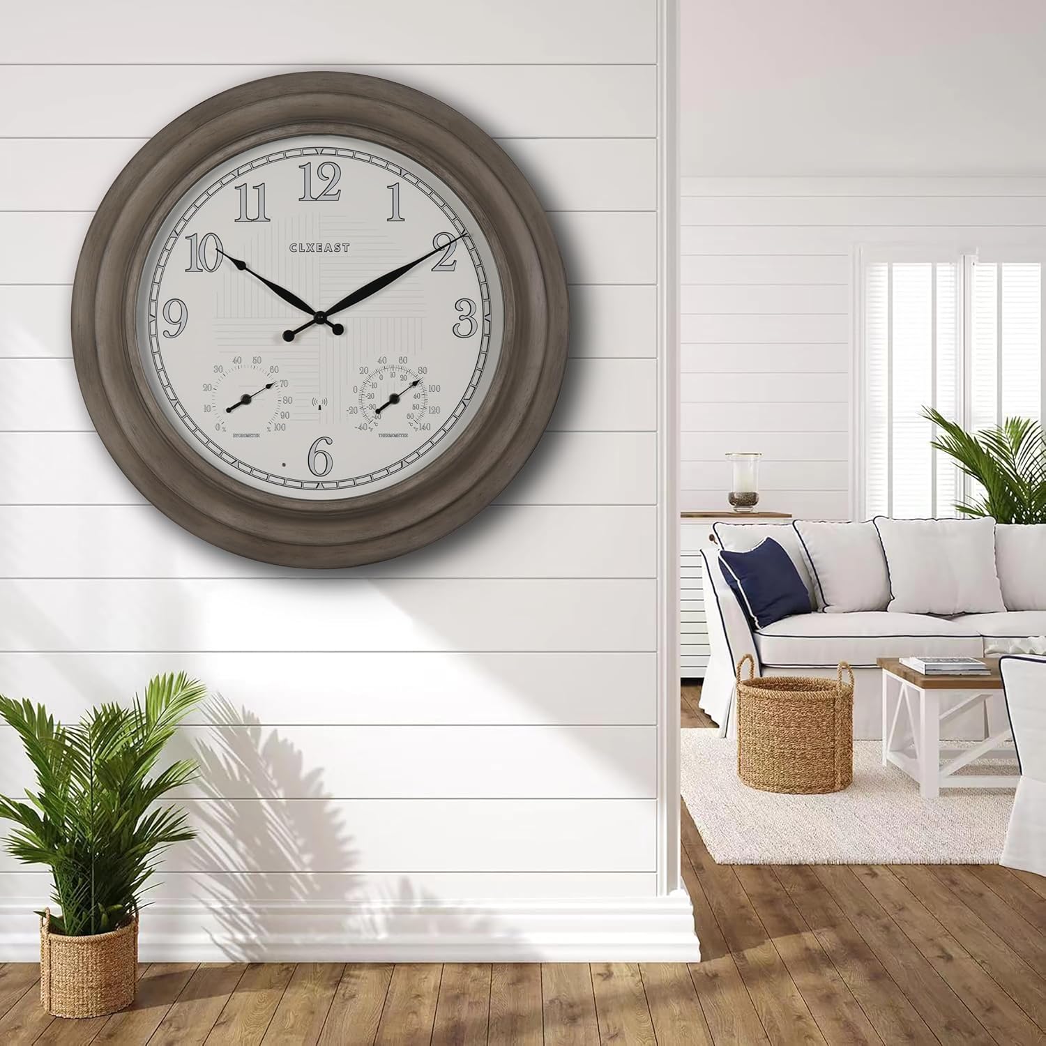 CLXEAST 24 Inch Self-Illuminated in/Outdoor Atomic Wall Clock with Temperature and Humidity, Oversized Large 24 Inch Wall Clocks for Living Room Decor, Brushed Grey Oak Wooden Finish