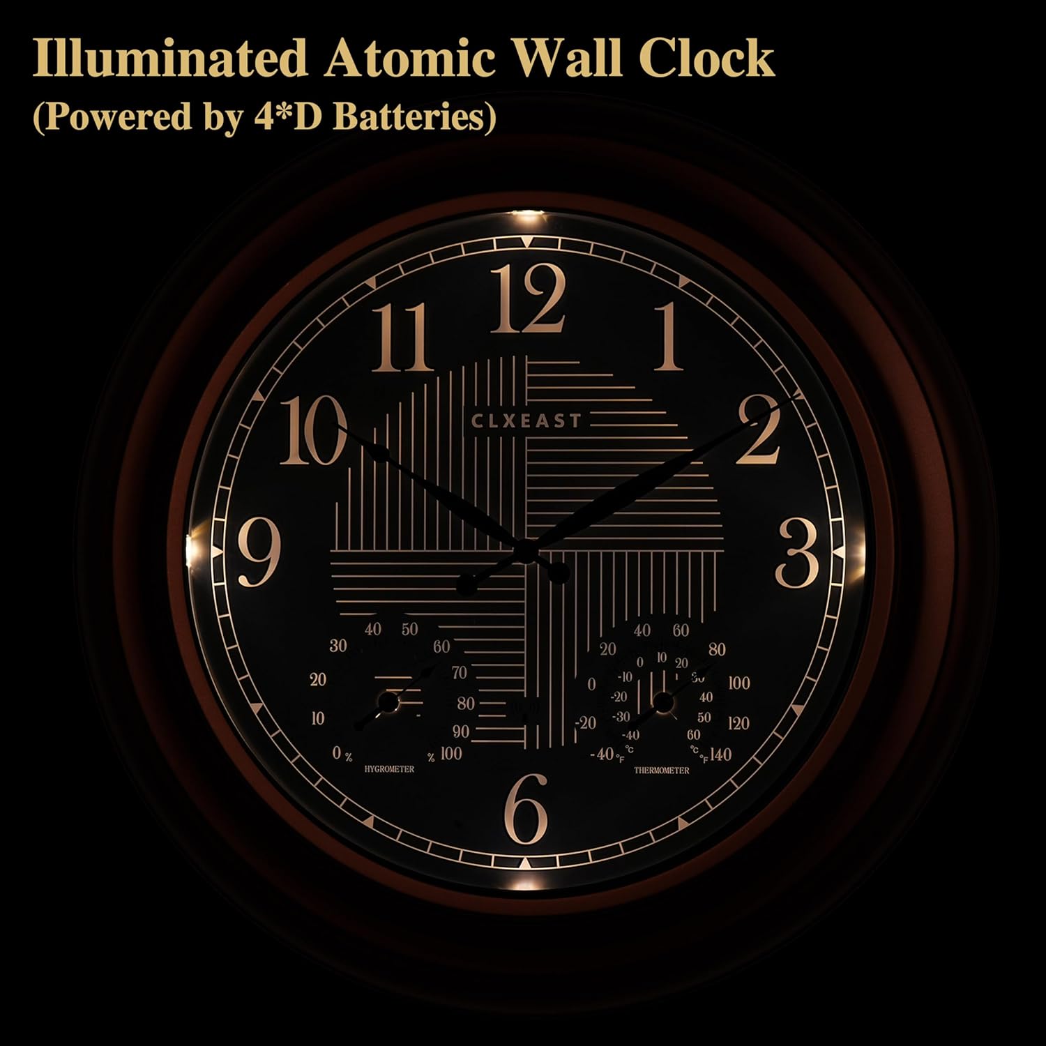 CLXEAST 24 Inch Illuminated in/Outdoor Lighted Atomic Analog Wall Clock with Thermometer & Hygrometer, Oversized Large Waterproof Wall Clocks for Living Room Decor,Bronze Finish