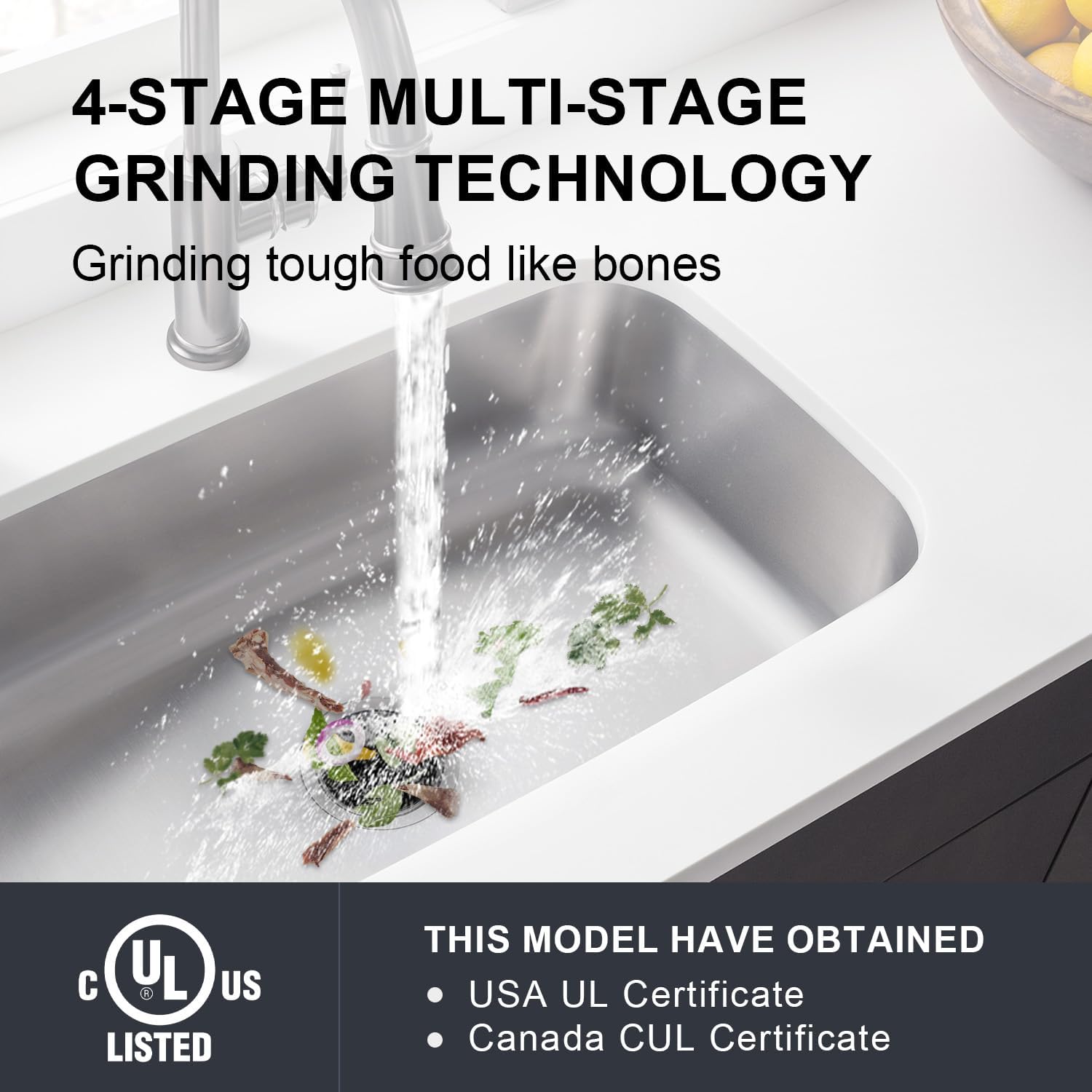 - Advanced Grinding Performance: 4-stage grinding technology pulverizes tough food waste like peach pits and small bones. High-speed AC motor delivers powerful performance while preventing clogs with precision-ground components.