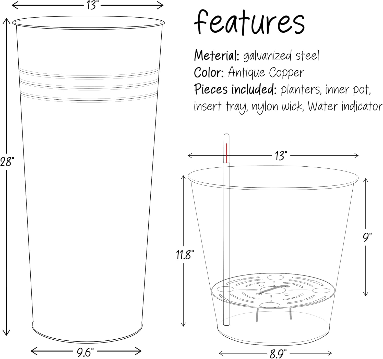 KOL 28'' Tall Galvanized Steel Planter Pot - Flower Pot with Water Level Indicator for Plants - 2 Pack Self Watering Planters - Round Bronze Powder Metal Planter Box - Indoor Outdoor Grande Plant