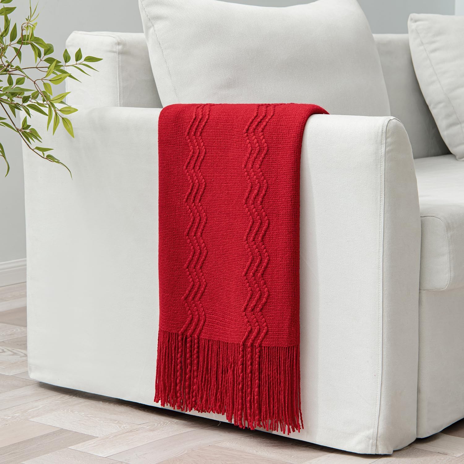 MIULEE Red Knitted Throw Blanket for Couch Boho Textured Cozy Woven Blanket with Tassels for Sofa Chair Bed Living Room Acrylic Wave Pattern 60"x80"