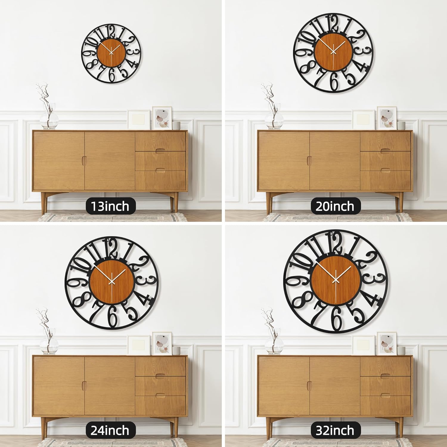 Maxstar Round Wall Clock for Living Room Decor Battery Operated Non Ticking Black Metal Wood Clocks for Home Living Room Garden Office Kitchen Decoration -20 inch