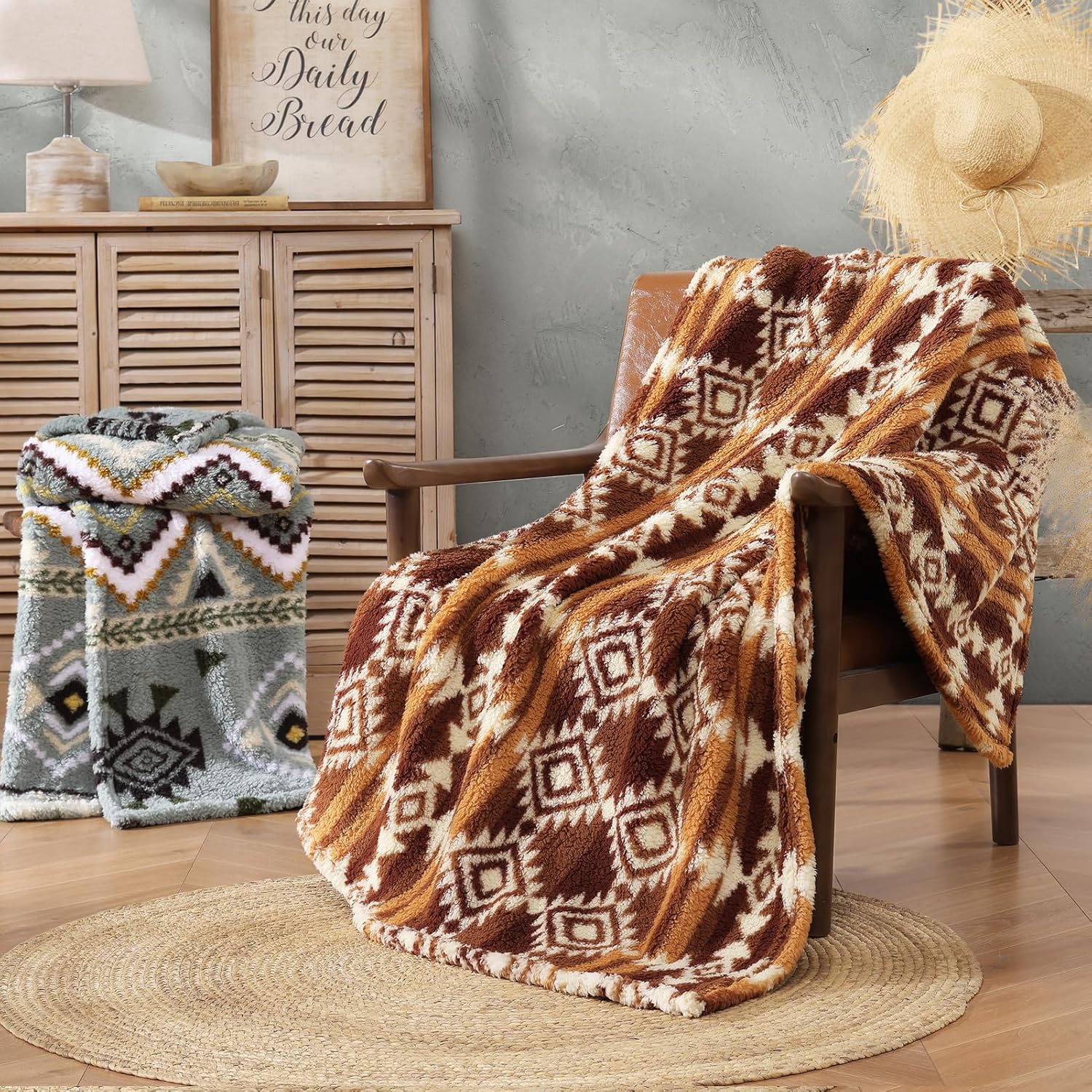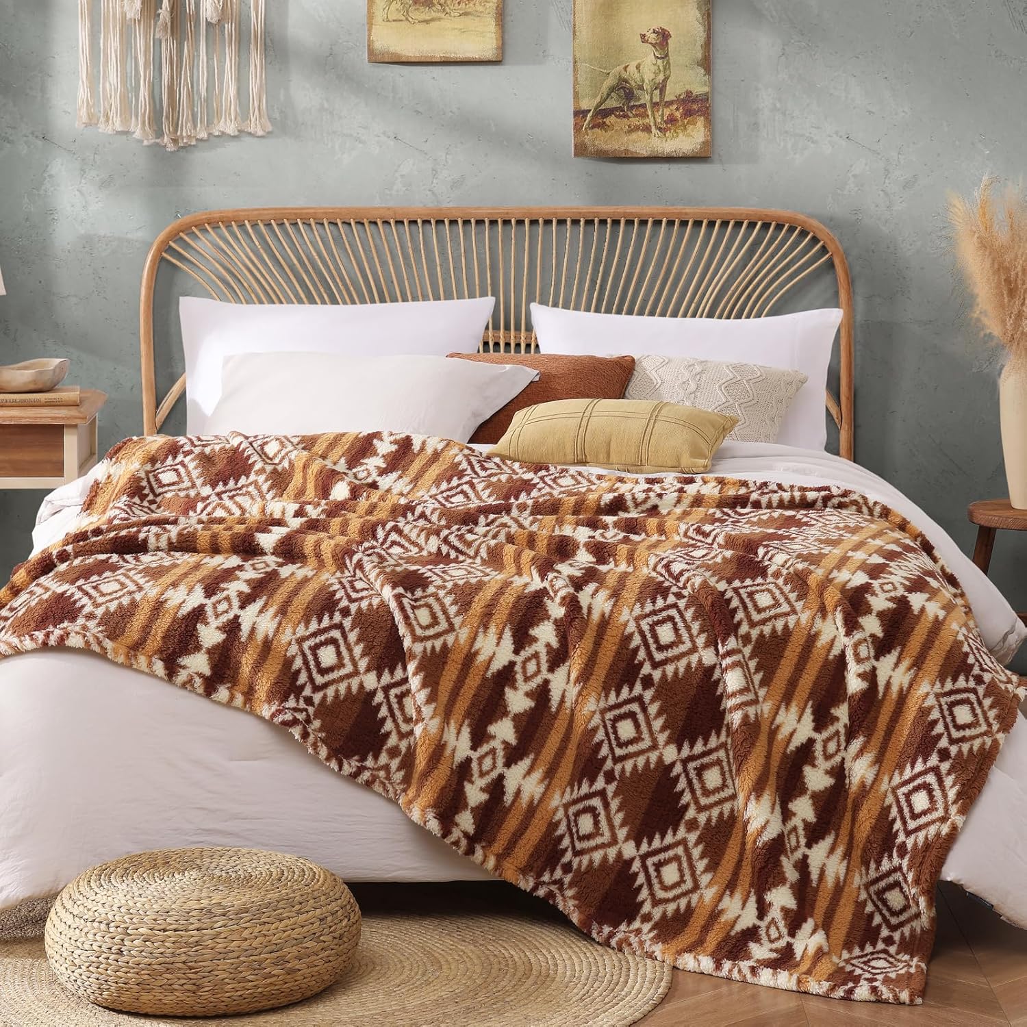 CASAAGUSTO Boho Sherpa Throw Blanket, Aztec, Ultra Soft, Warm, Cozy, Plush, Thick Fleece Bohemian Throw Blanket for Couch, Bed, Sofa (Terracotta 50 * 60 Inch)