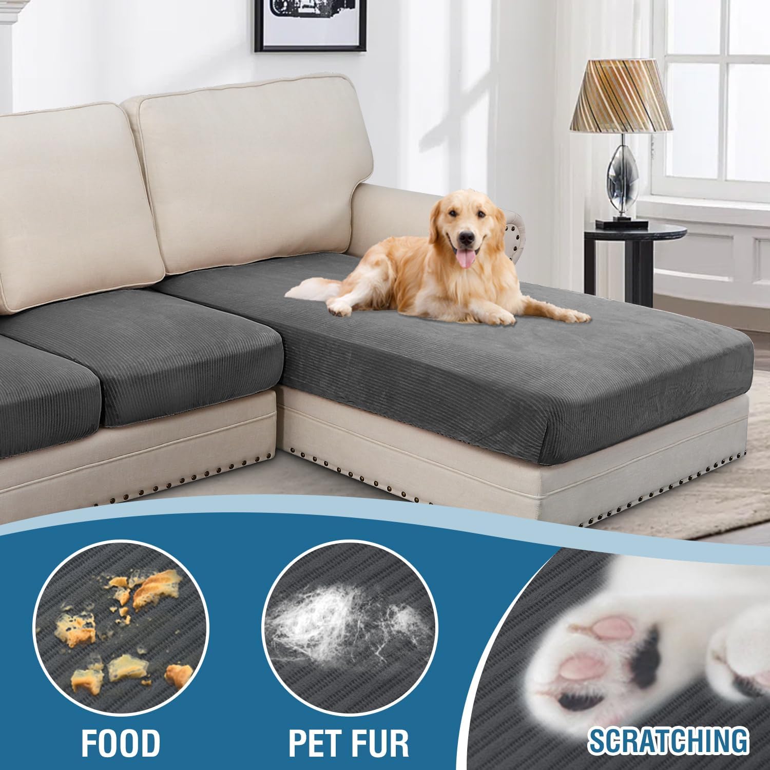 - INCREDIBLY COMFORTABLE VELVET: Products passed GLOBAL RECYCLED STANDARD certificate.This innovated stretch sofa slipcovers are constructed with 3 PIECES,including 1 Chaise cover and 2 individual cushion covers. Crafted from luxurious velvet plush fabric with unique striped cuts, feature thick, soft, smooth, anti-wrinkle, no fading, durable as well as highly stretch. Protect your cushion furniture from daily wears and tears, stains, kids, scratches from pet claws, dogs or accidental spills