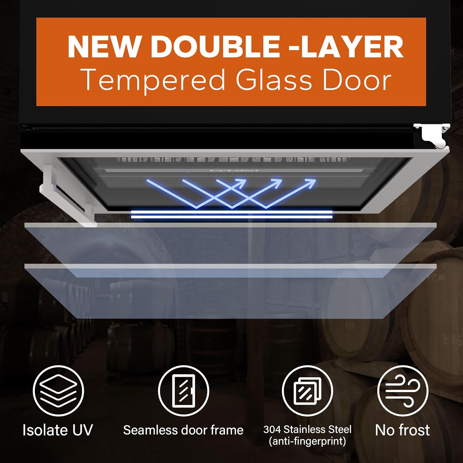 - 【Reversible double-glazed stainless steel door】We use double glass door with UV protection and high sealing to keep the flavor of red wine and prevent it from oxidizing. Good sealing to keep the temperature inside the refrigerator. Soft and warm light, restore the real wine cellar light environment. Brushed stainless steel door frame, effective anti-fingerprint and anti-rust. We designed hidden door hinges, so you can freely choose the door orientation according to your needs.
