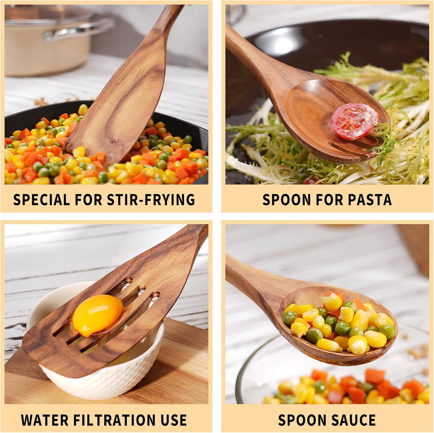 - NATURAL TEAK WOOD: Crafted from solid teak wood, our utensil set is 100% handmade and eco-friendly. It's durable and crack-free, unlike silicone or bamboo alternatives. Note: Natural wood utensils may have slight color variations.
