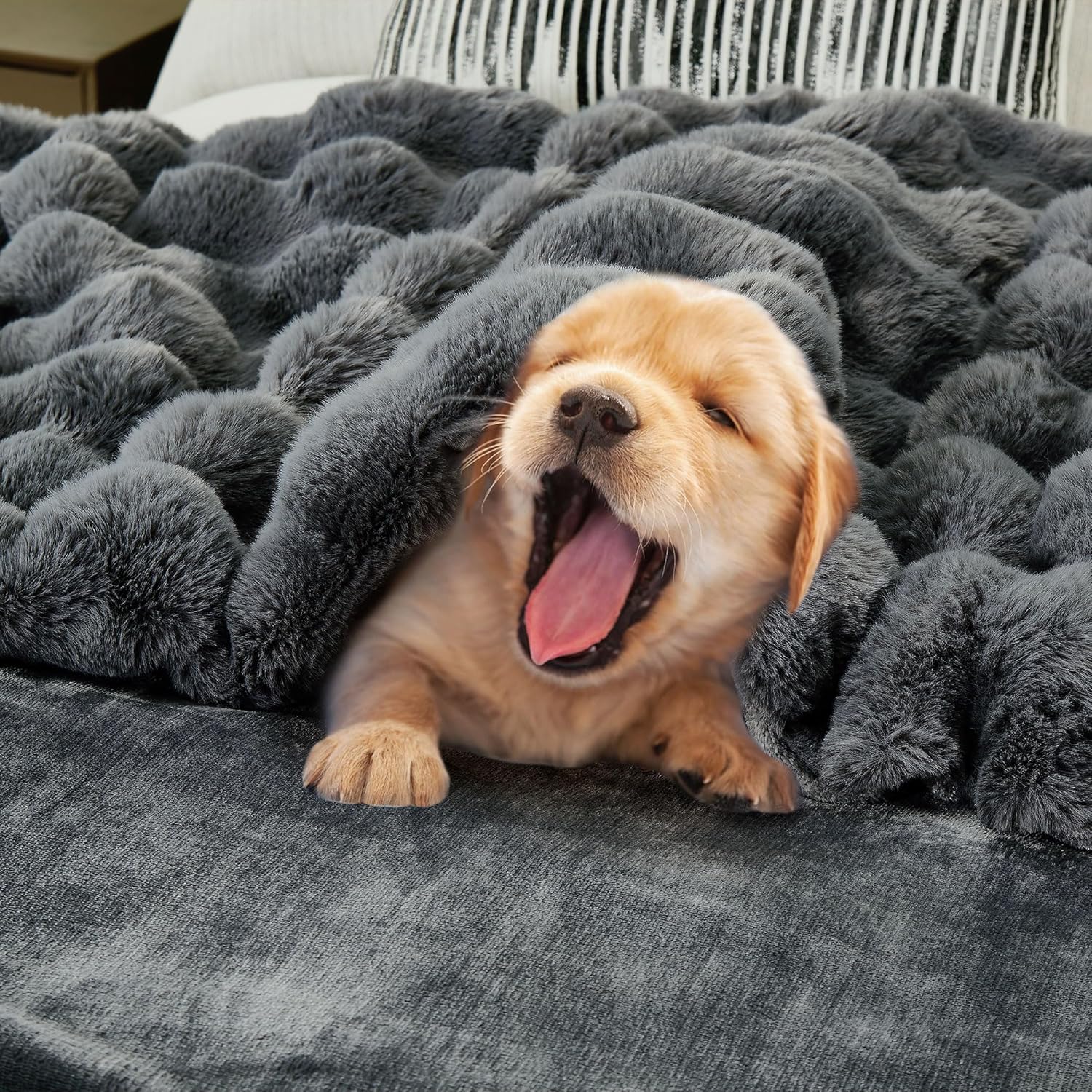 - 【Simple pleasures & Pure happiness】Blowing bubbles is the most easy way to feel happiness in every generation. DREAMNINE luxury shaggy fluffy fur twin size blanket make happy bubble last in daily life. Every bulge pattern at this soft decorative oversized plush fur throw blanket like beautiful sparkling bubbles, cute and stable. Running your finner through it, all kinds of stress release immediately. You will luxuriate in the pure of cozy. Live in pleasures and happiness, your lifes will certainly be colorful and lasting appeal.
