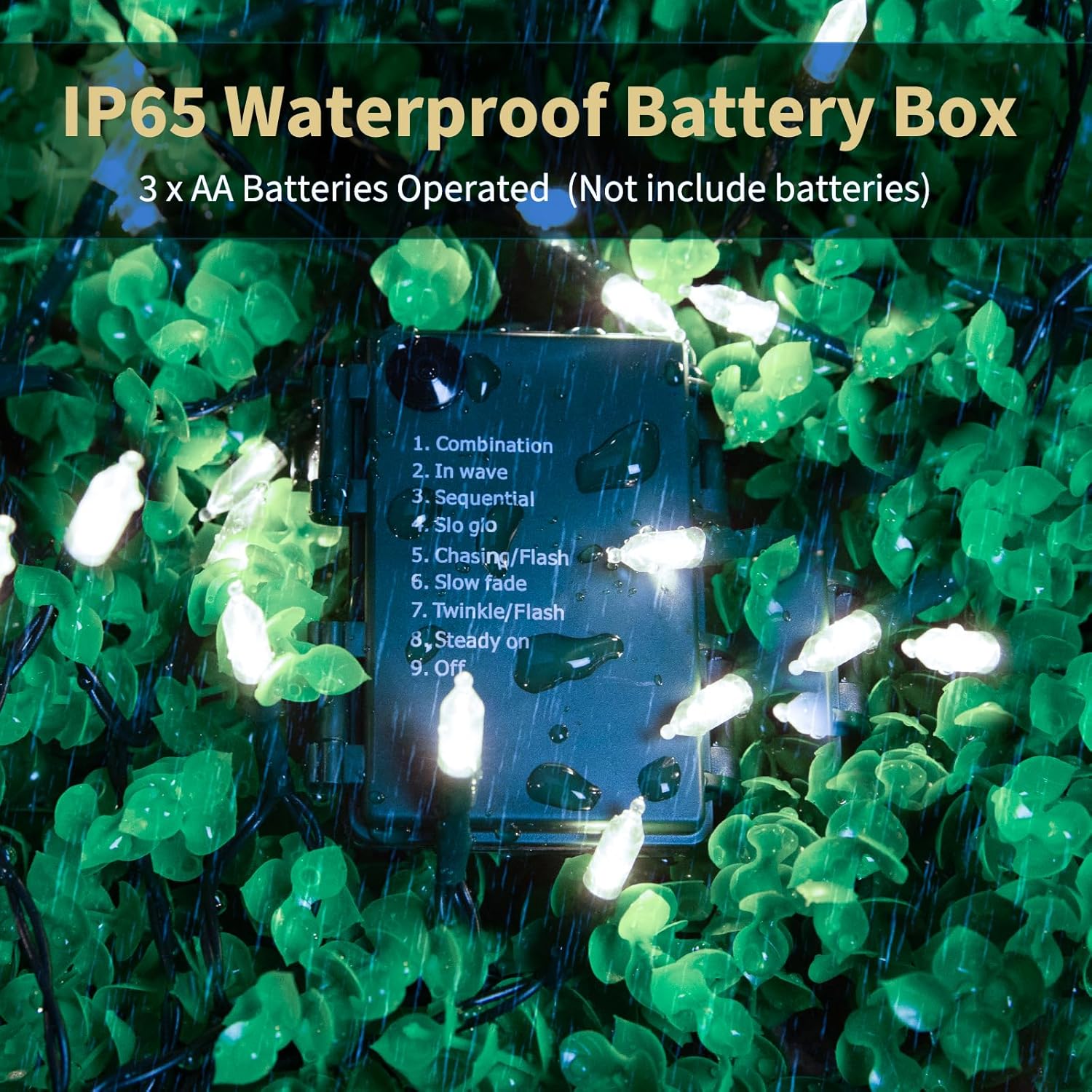 - 【Manual operation】There is 8 various fantastic lighting effects adapting to desired occasions or events: press the button on control box repeatedly to select 1.combination, 2.in wave, 3.sequential, 4.slow glow, 5.chasing or flash, 6.slow fade, 7.twinkle or flash or 8.steady on