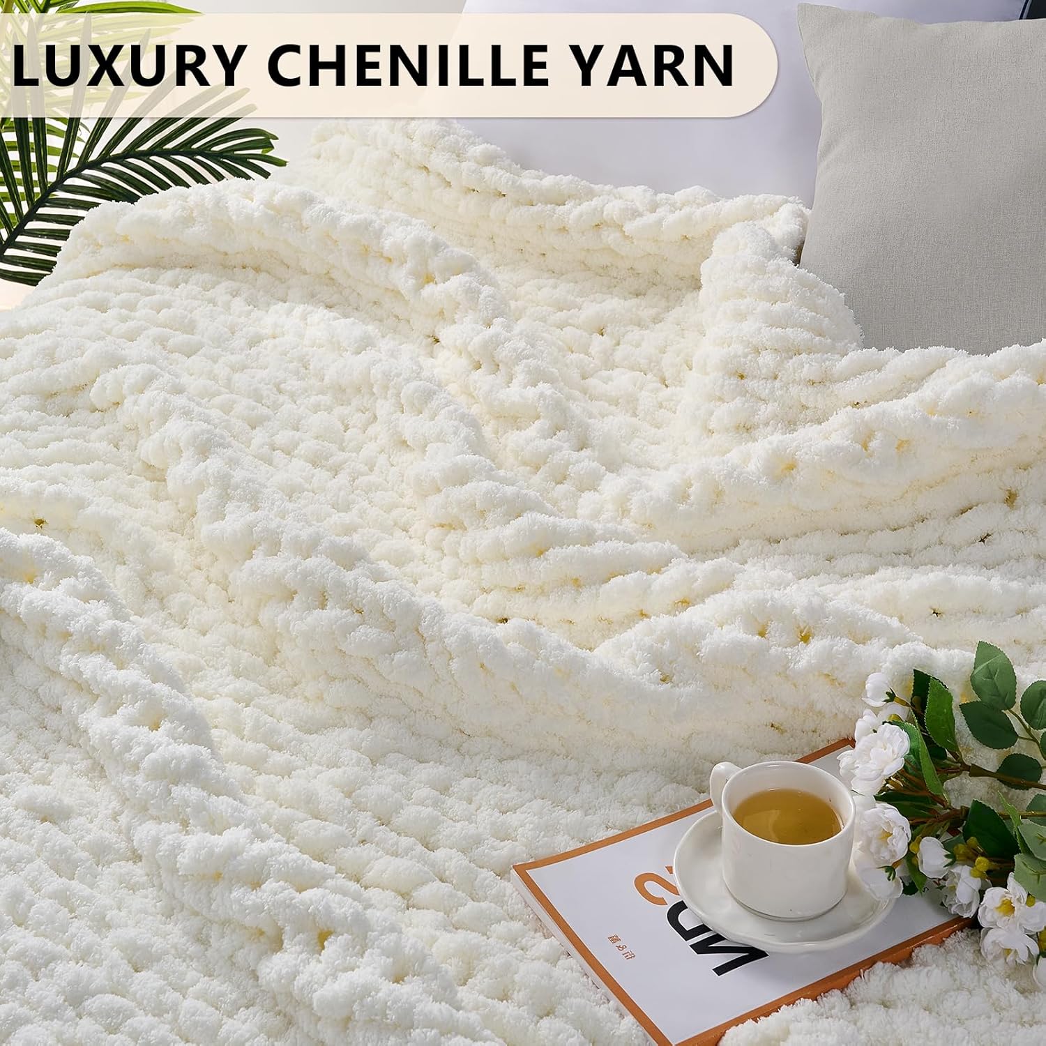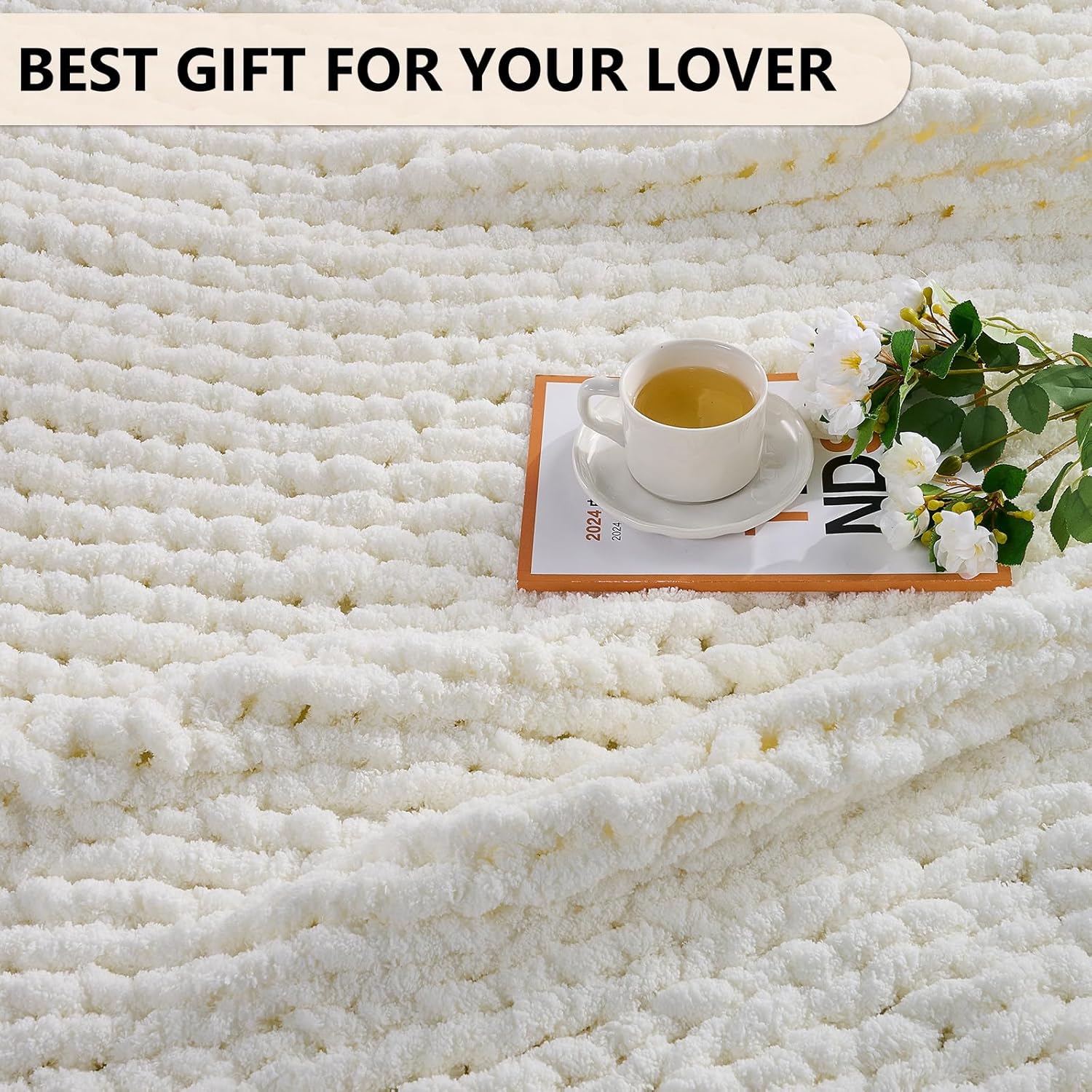 L'AGRATY Chunky Knit Blanket Throw: Soft Chenille Yarn Throw Blanket 50x60 - Handmade Thick Cable Crochet Blanket - Large Chunky Rope Throw Blanket for Couch Sofa Bed Home Decor(Cream White)