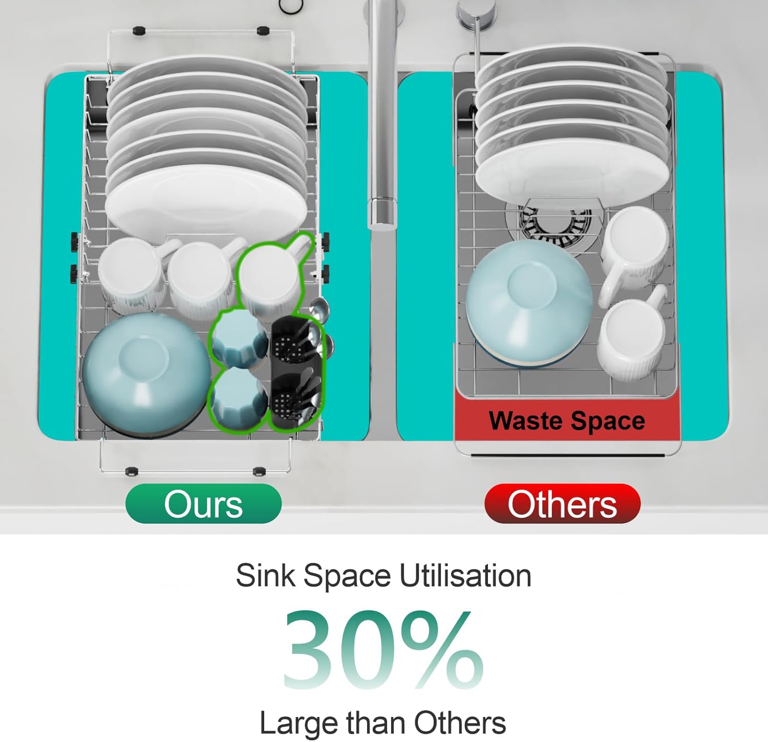 - True Expandable, Real Capacity Boost: Unlike other racks that only extend handles, our dish drainer expands as a whole unit—truly increasing your drying space, allowing you to comfortably hold at least 3 extra cups in addition to 8 plates, bowls, utensils, and even fresh fruits and veggies. This innovative design not only ensures perfect sink compatibility but genuinely maximizes your drying area.