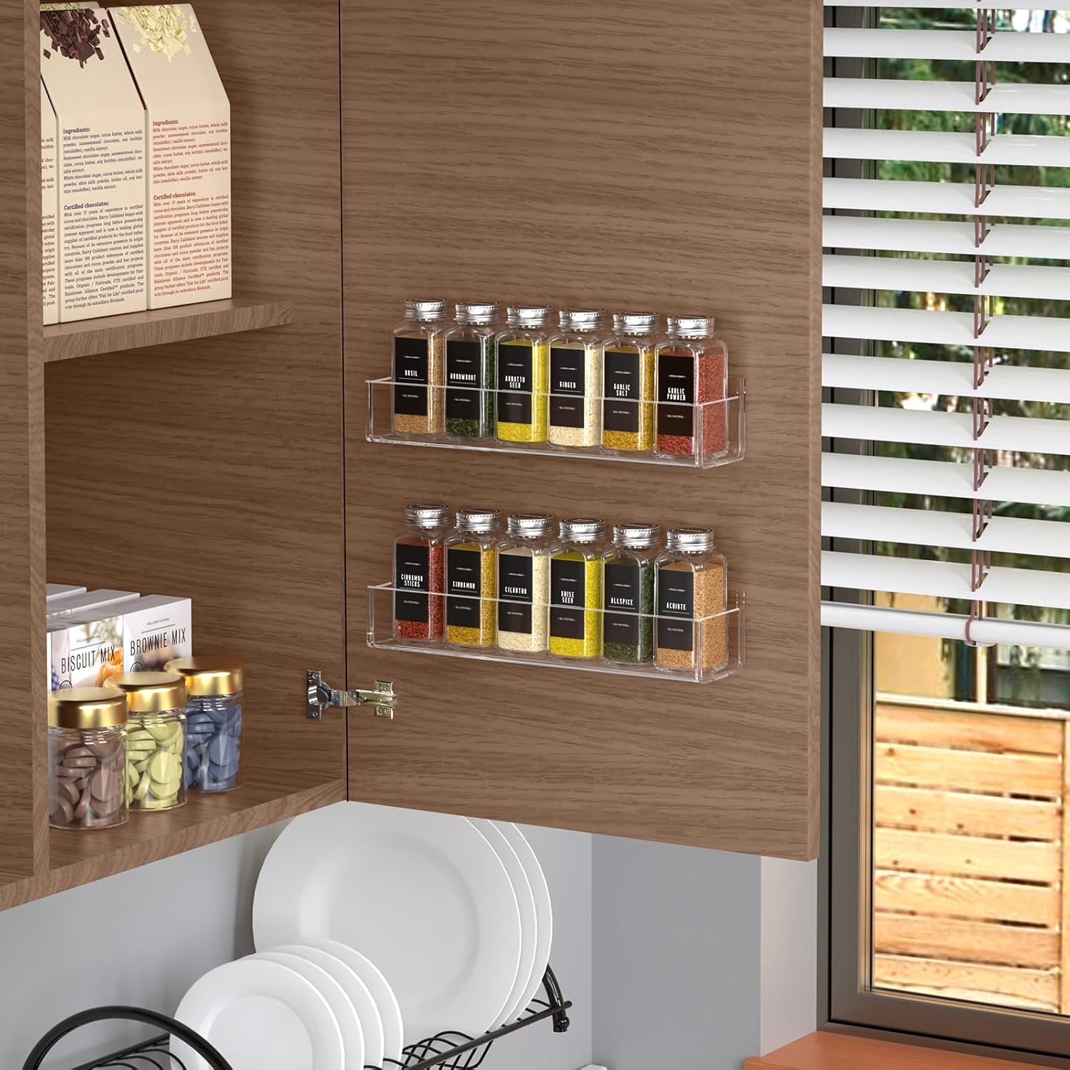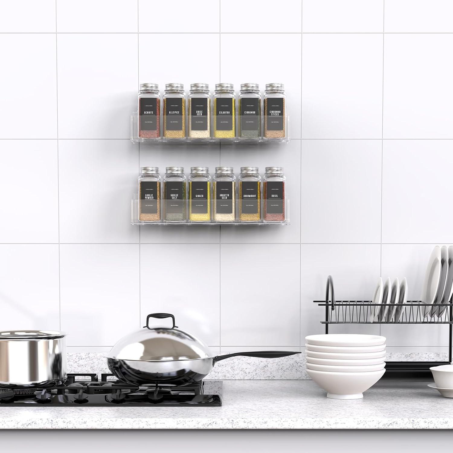 PMMASTO Adhesive Acrylic Spice Rack Organizer with 12 Empty Square Spice Jars, 238 Spice Labels with Chalk Marker and Funnel Complete Set for Kitchen Cabinet/Pantry Door (Clear - 2 Pack)