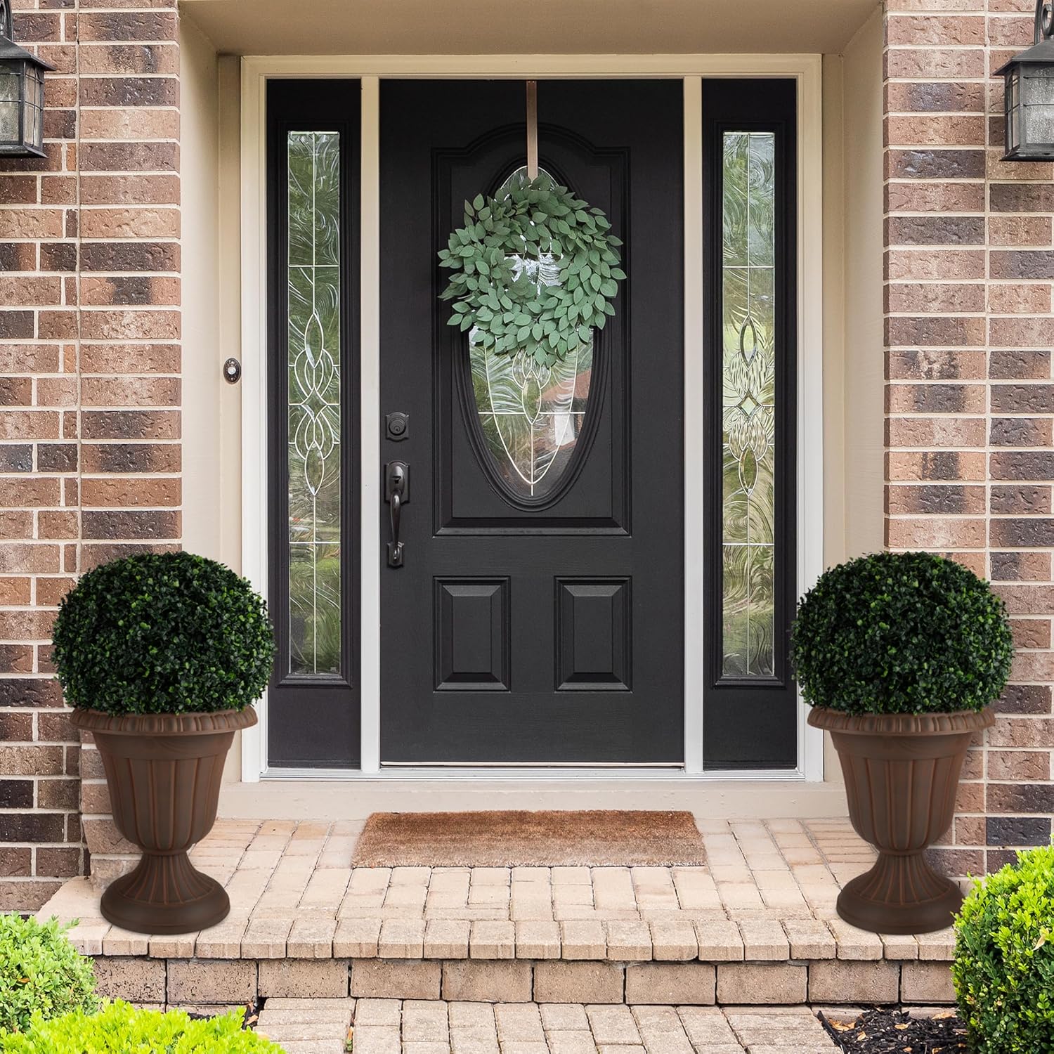 - PRODUCT DETAILS - Materials: Recycled Polypropylene Plastic. Dimensions: (L) 16β x (W) 16β x (H) 18β; Weight: 3.8lbs; Interior Planting Space: 13β Diameter x (H) 12.75β; Soil Capacity: 30lbs/13.6L. Front Door Planters Outdoor Set of 2. Color: Brown.