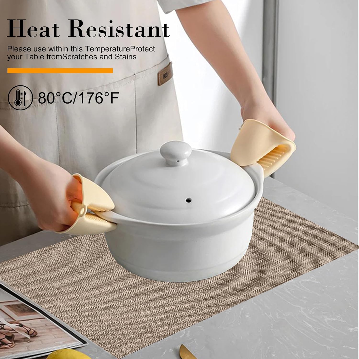 - Protect Your Table:Our placemats protect your table from scratches and spills while adding style. Heat-resistant up to 176°F (80°C), they also keep your food warm. With high-quality woven vinyl construction, they resist stains and water for daily use. Elevate your dining experience with these elegant and durable mats.