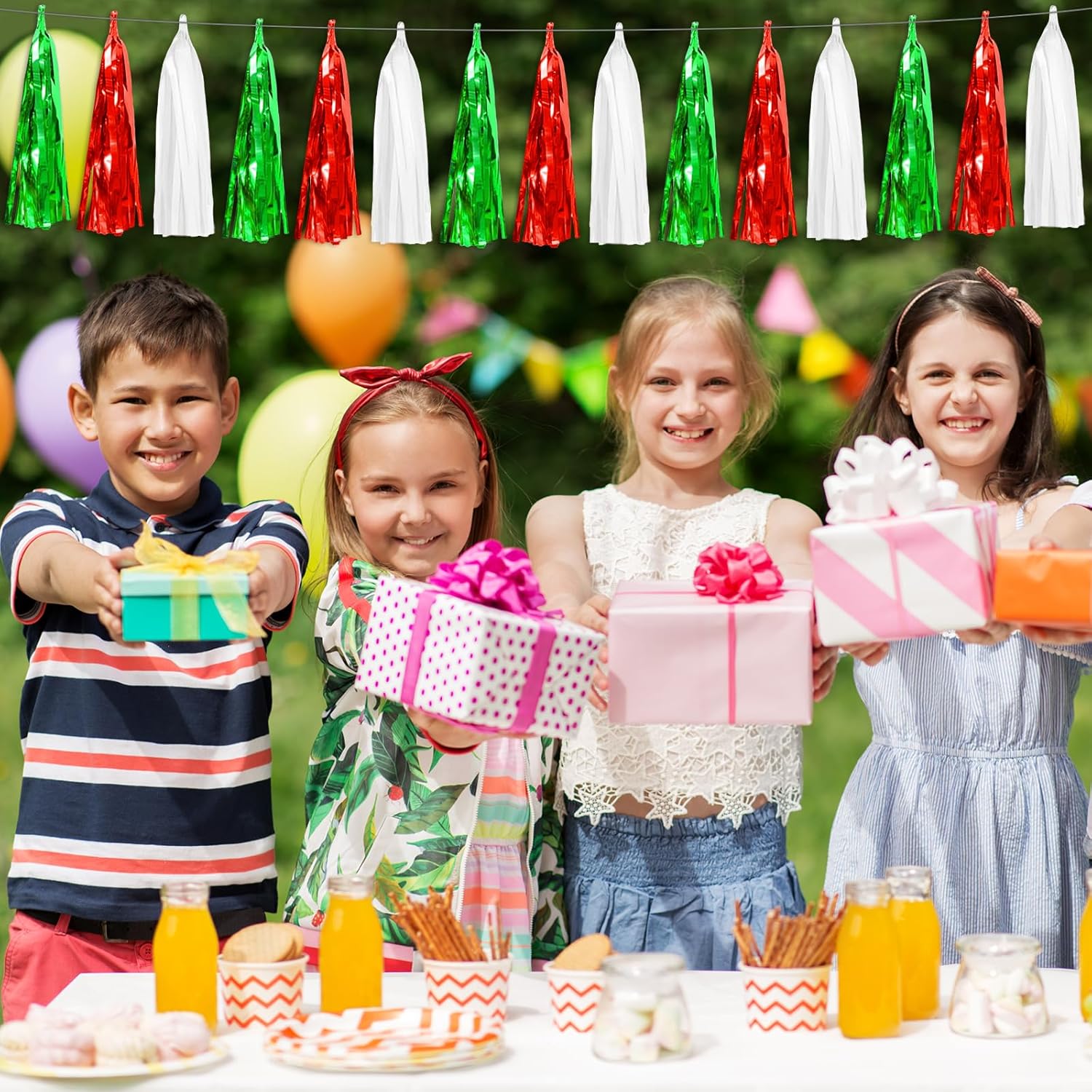 - 【Perfect Party Decoration】The Red Green White tinsel garlands are designed in a metallic Fringe, bright, and beautiful, at the same time, they shine in the sun, and these gorgeous tassel garlands create a wonderful backdrop or centerpiece for your party space. and bring you, your family, and your friend's good Visual effects. your party many emotional and touching moments where a lot of pictures will be taken and everybody will have a wonderful time together.