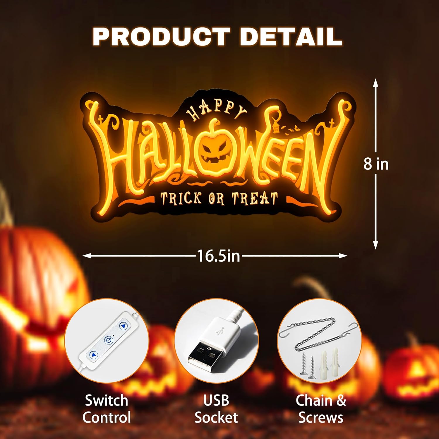 - Easy Installation - The backboard of the neon light has two pre-drilled holes. The package includes one 0.7-meter chain, two screws, two plugs, and two hooks, making it easy to hang or fix on the wall. The USB cable (2 meters) is long enough to be placed in various positions. Simply plug it into a USB socket, and you will experience the unique atmosphere of Happy Halloween.