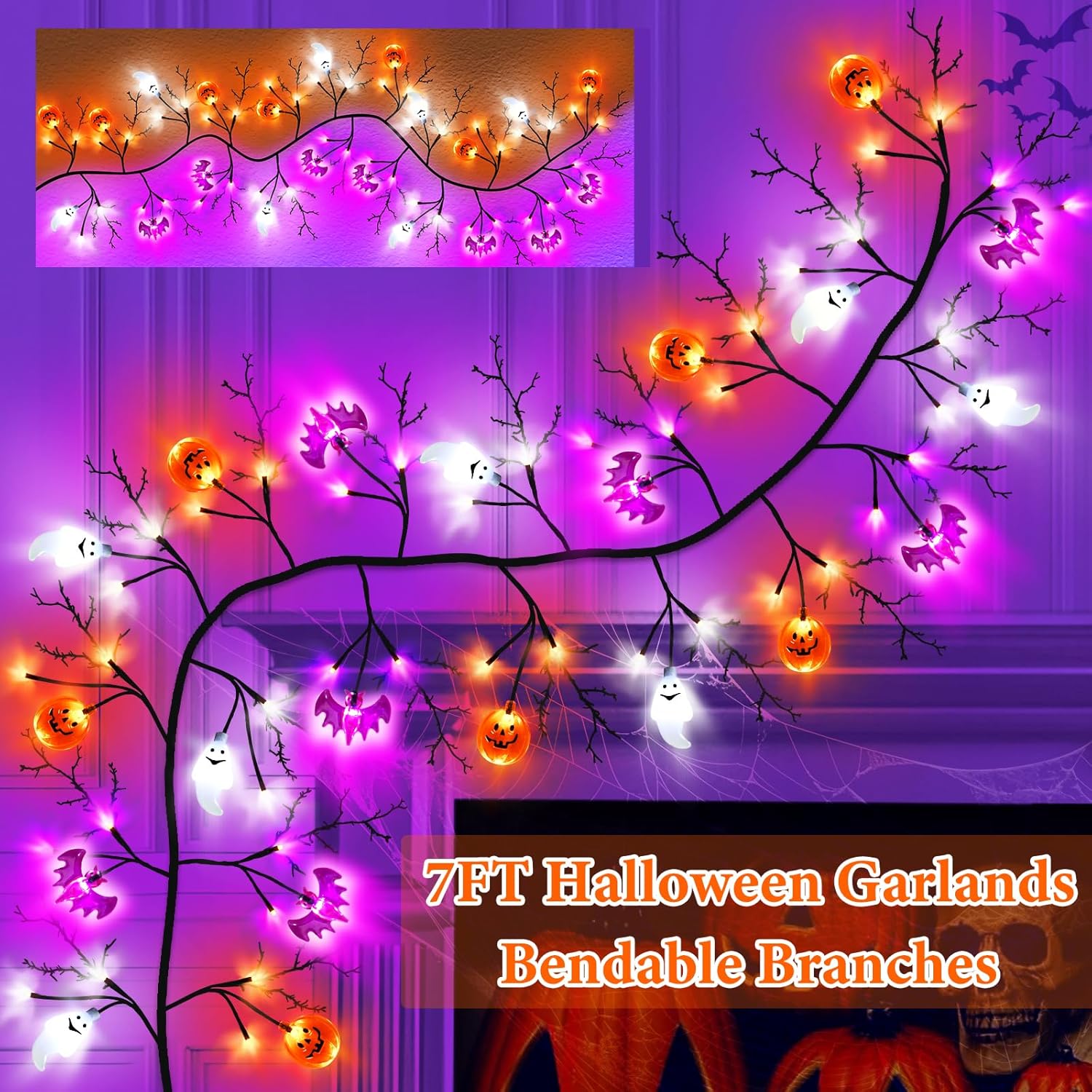 - 【Halloween Garland Decorations】You will receive 7 Feet Long Realistic Halloween garland with 63 LED lights ,Includes 7 pcs orange pumpkins 7 pcs purple bats and 7pcs white ghost,The black Vine Twigs can present a mysterious atmosphere, Ideal for Fall Halloween indoor outdoor decor