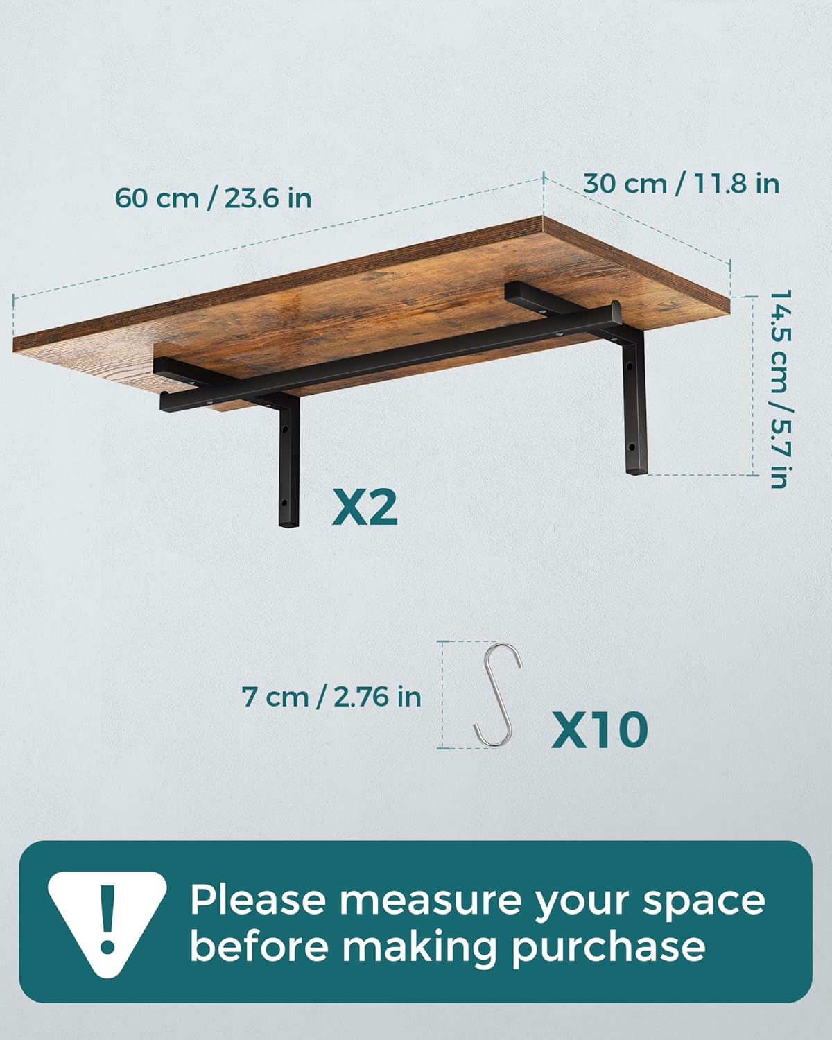 - 【Flexible Installation Options】Includes two 11.8"D x 23.6"W pot shelves with 10 S hooks. Install side by side for a 47.2in long shelf or separately to suit your wall space and storage needs