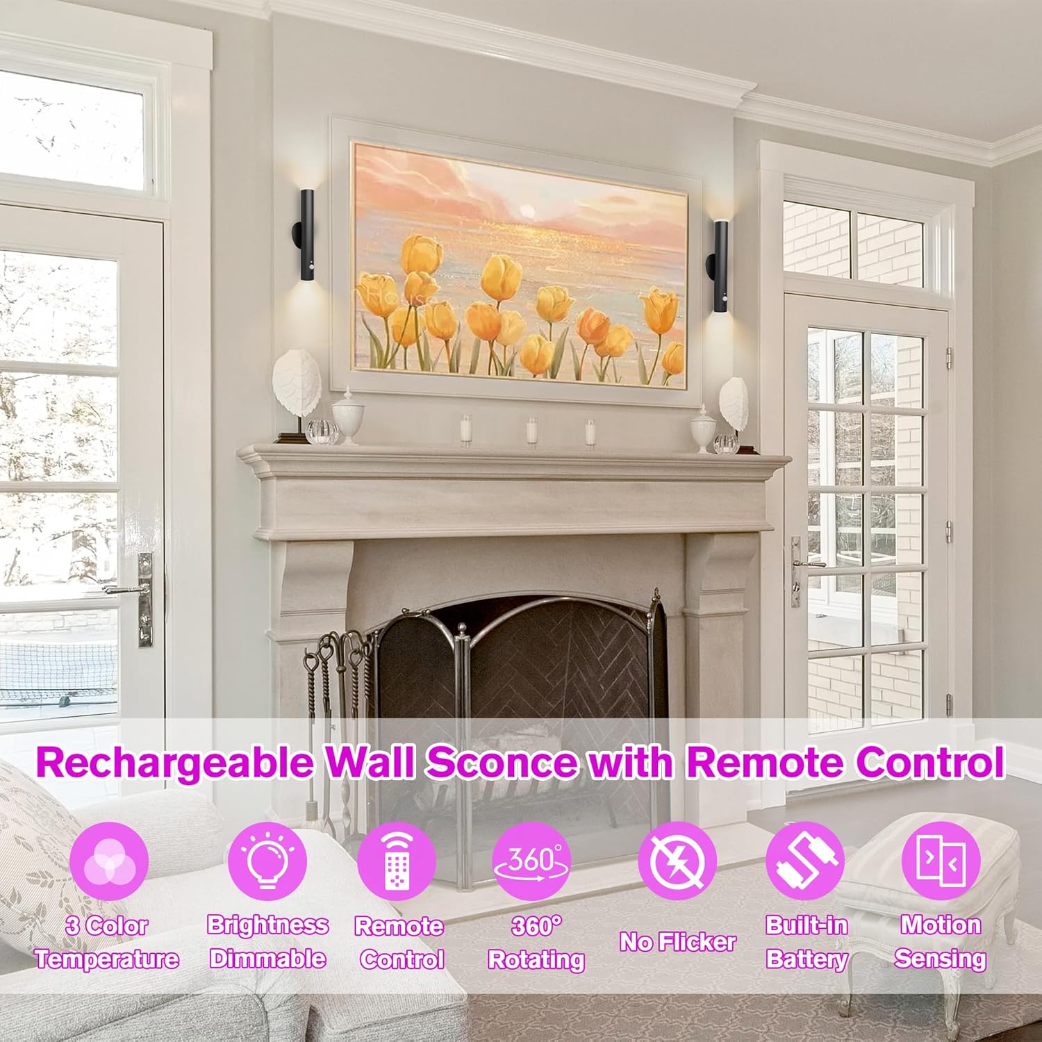 Battery Operated Wall Sconce, Rechargeable Wall Lights with Motion Sensor, Remote Control, Dimmable Metal Magnetic Wall Lamp for Decor, Bedroom, Living Room, Night Light (Black, 1Pcs)