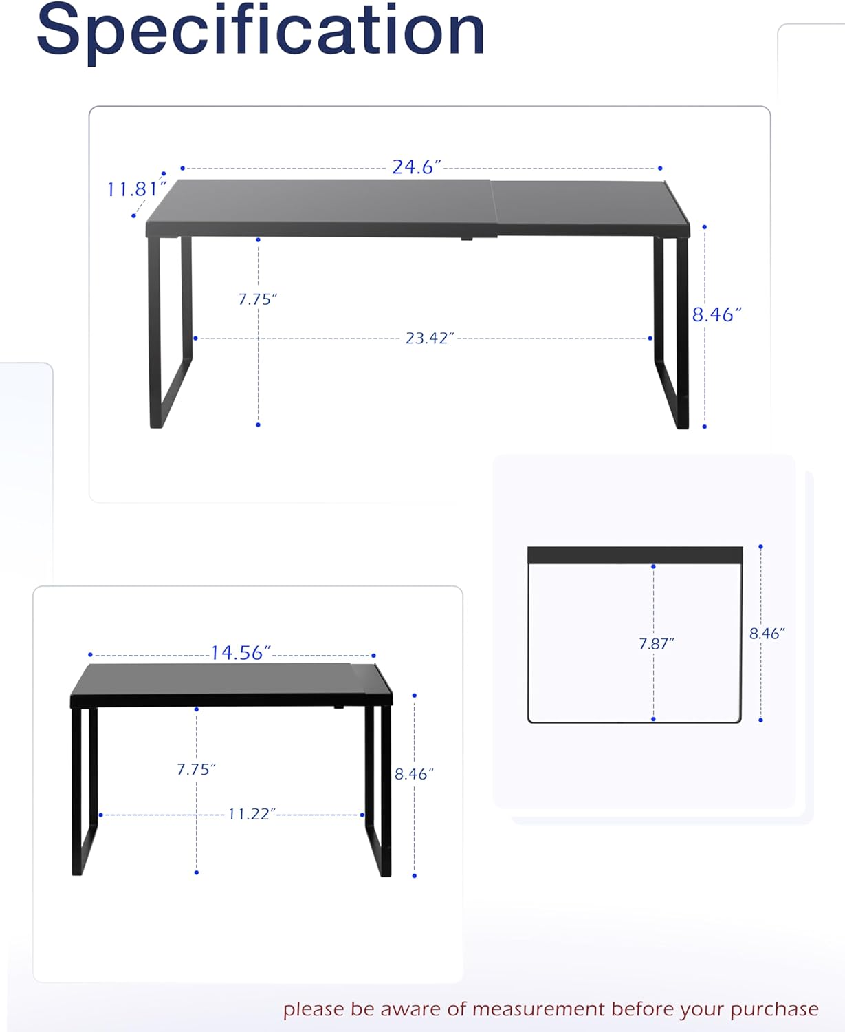 - SPECIFICATION: 11.8ββD * 14.56-24.6ββW * 8.46ββH. If you purchase 2 of these expandable shelves set you can stack one of top of another thereby creating a two-tier storage space. Easy to assemble with a clear manual.