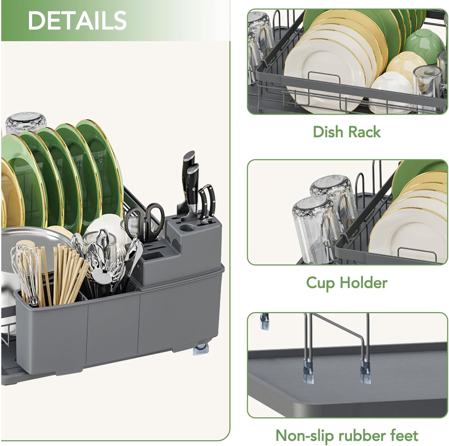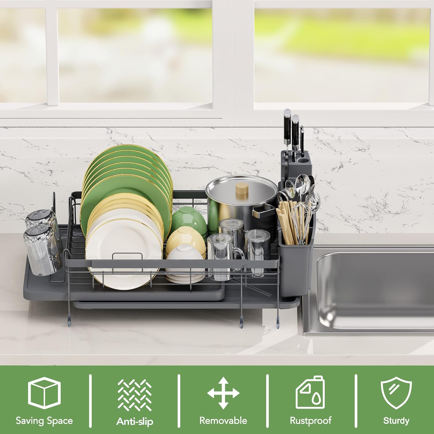 ROTTOGOON Expandable Dish Drying Rack,Multifunctional Adjustable Dish Drainer with Swivel Spout and Anti-Rust Dish Rack with Removable Cutlery & Cup Holders for Kitchen Counter,Dark Grey