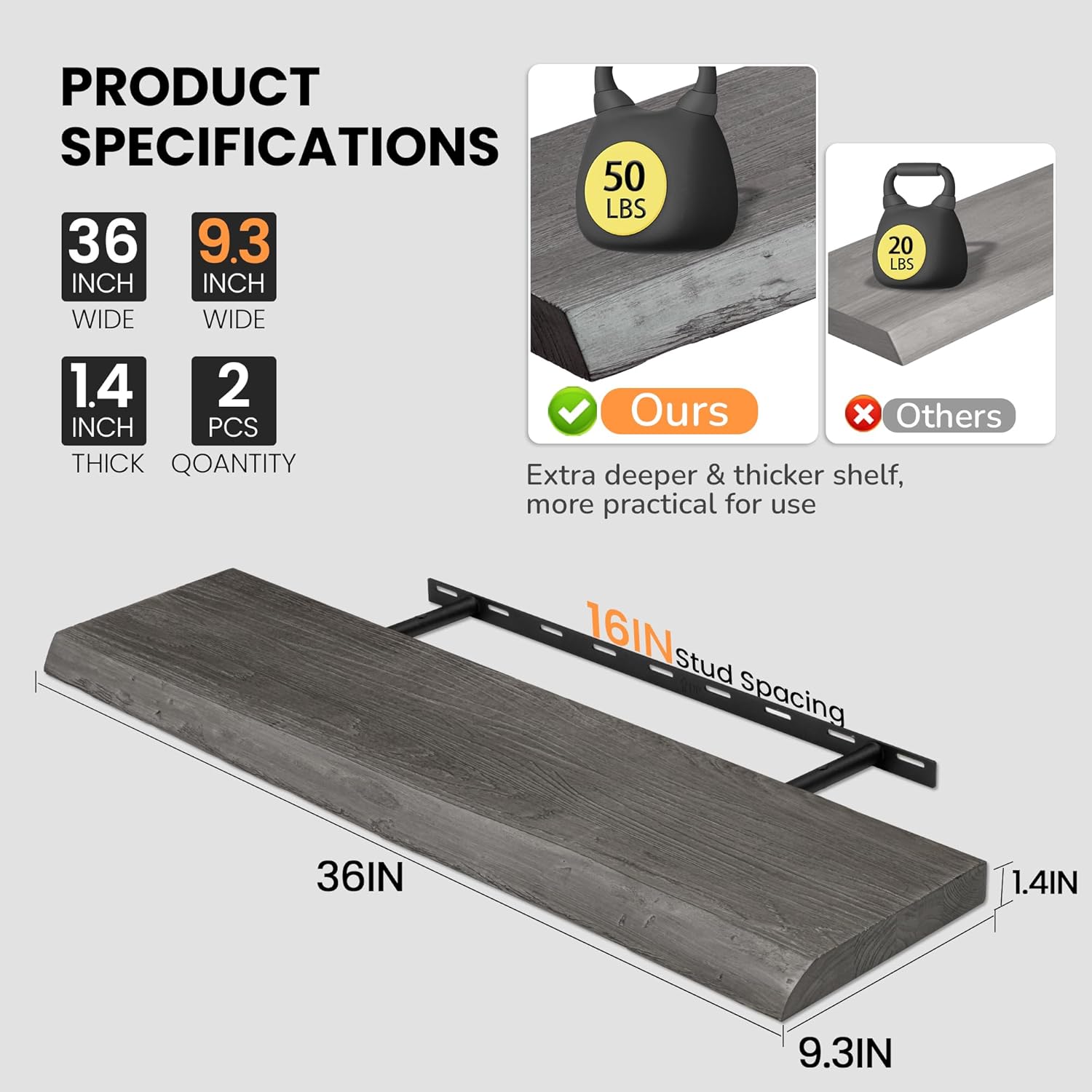 Floating Shelves for Wall, 36"x9.3" Rustic Solid Live-Edge Elm Wood Wall Shelves, Heavy-Duty Floating Shelves with Invisible Brackets, Set of 2 for Living Room, Bedroom, and Kitchen, Grey Finish