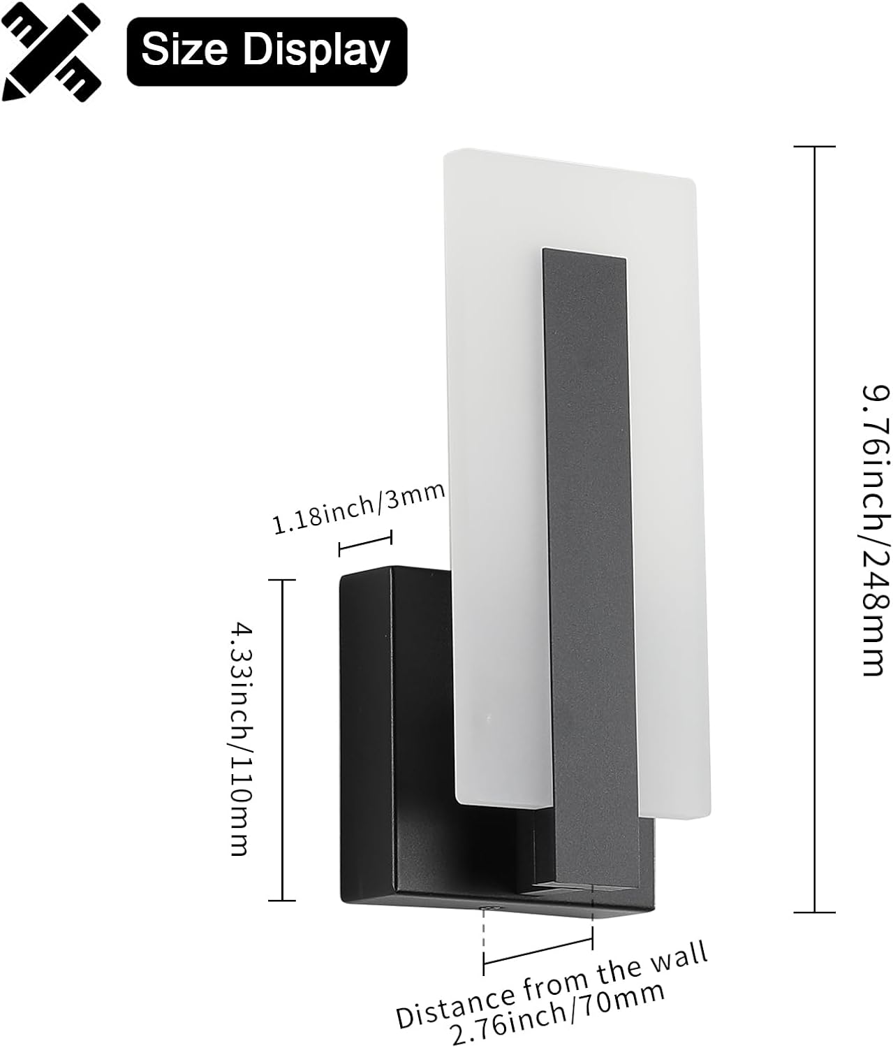 - Wall Sconce Size: This black wall sconce is 9.76 inches long and sits 2.76 inches from the wall.You can install it either up or down, bringing a more artistic ambiance to your home.