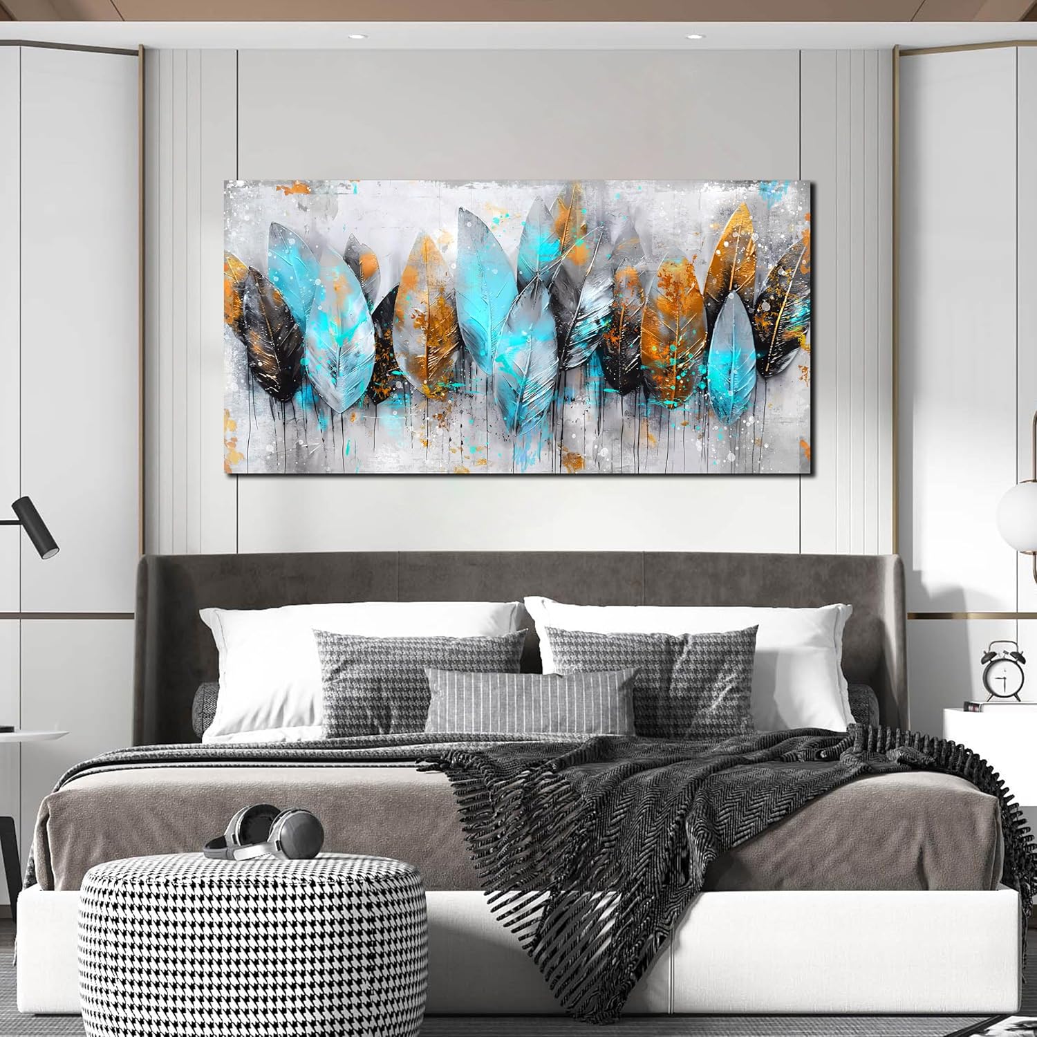 - STYLISH CANVAS ART DESIGN: Looks exactly as pictured,Good idea for home interior walls decor such as guest room, office decor, hotel, dining room wall decor and others. Itβs a great gift ideal to your friends.Leaf canvas wall art,Modern blue and gray living room wall art