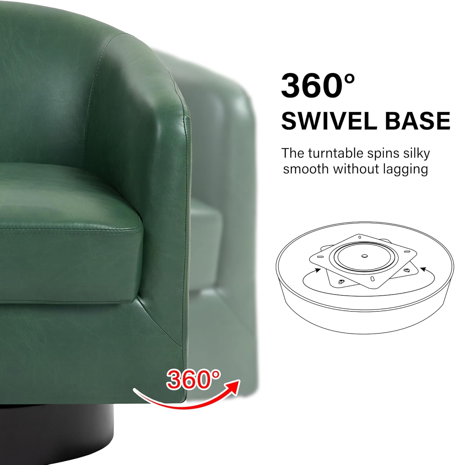 Swivel Barrel Accent Chair, Modern Round Faux Leather Arm Chair for Living Room, Bedroom, Comfy Club Reading Chairs for Adults(Faux Leather, Green, Set of 2)