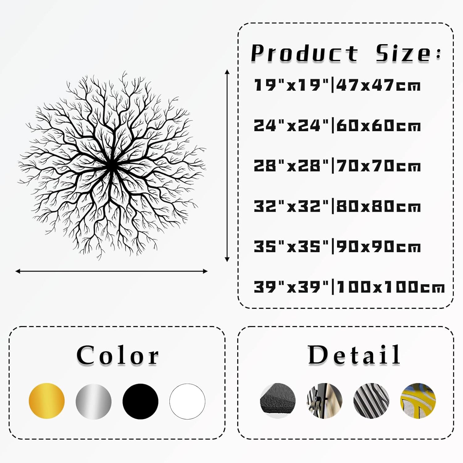 - 【Multiple Sizes】 Choosing the right size is very important, and our metal art wall decorations are available in a variety of sizes. They are 19"x19"|47x47cm, 24"x24"|60x60cm, 28"x28"|70x70cm, 32"x32"|80x80cm, 35"x35"|90x90cm, 39"x39"|100x100cm