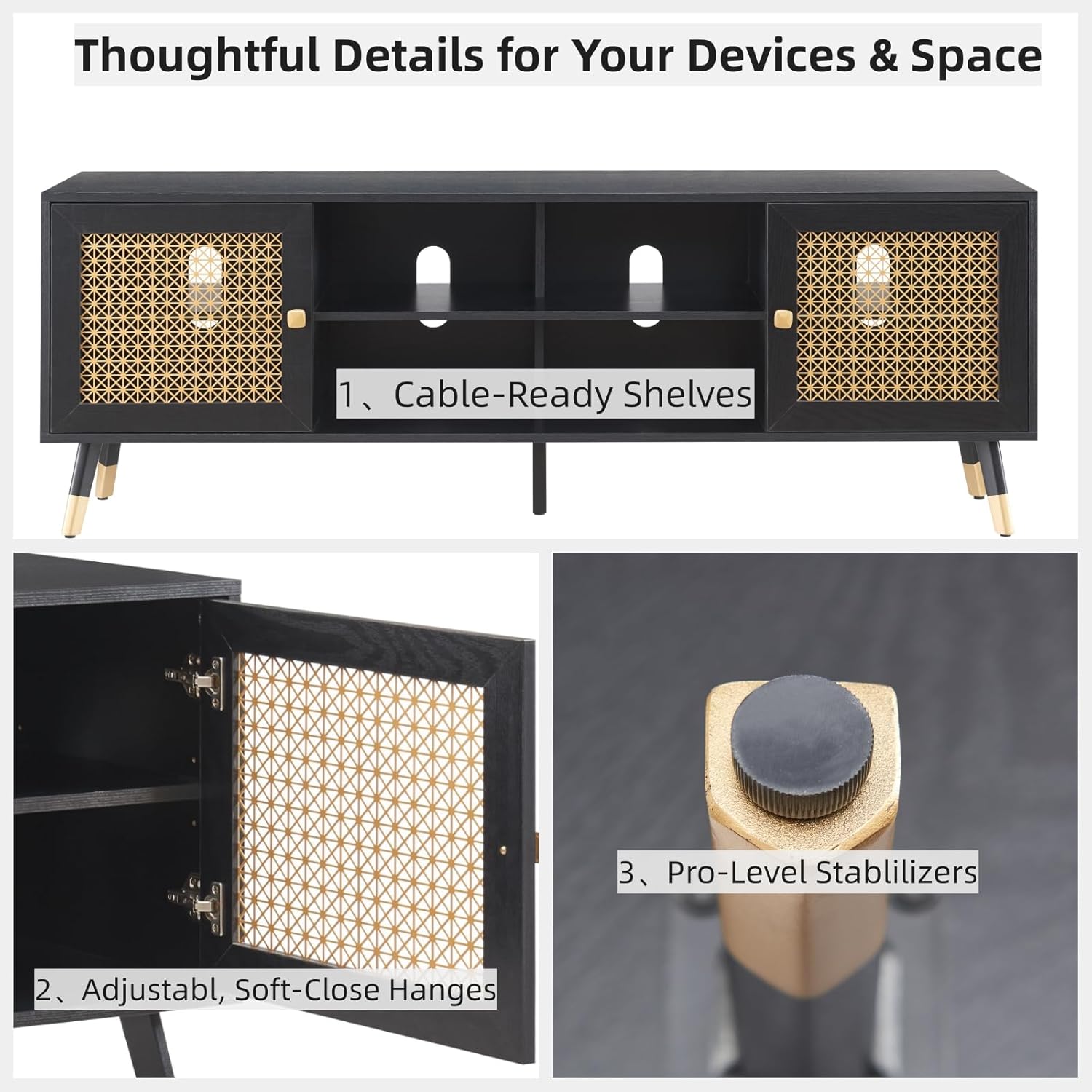 JYED Mid Century Modern TV Stand and Console for TVs Up to 75" - Black Entertainment Center, 2 Gold Metal Mesh Doors & MDF Wood Grain, 15.8" D x 66" W x 23.5" H