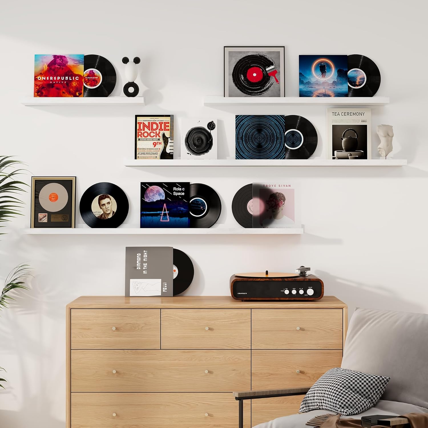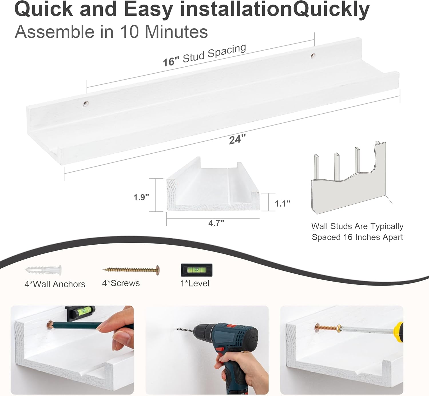 - Picture Ledge Design: Ideal for displaying photos, artwork, small plants, or collectibles, these shelves feature a thoughtful ledge design with a subtle lip and a shallow groove behind it. This design securely holds items in place while maintaining a clean, modern look.