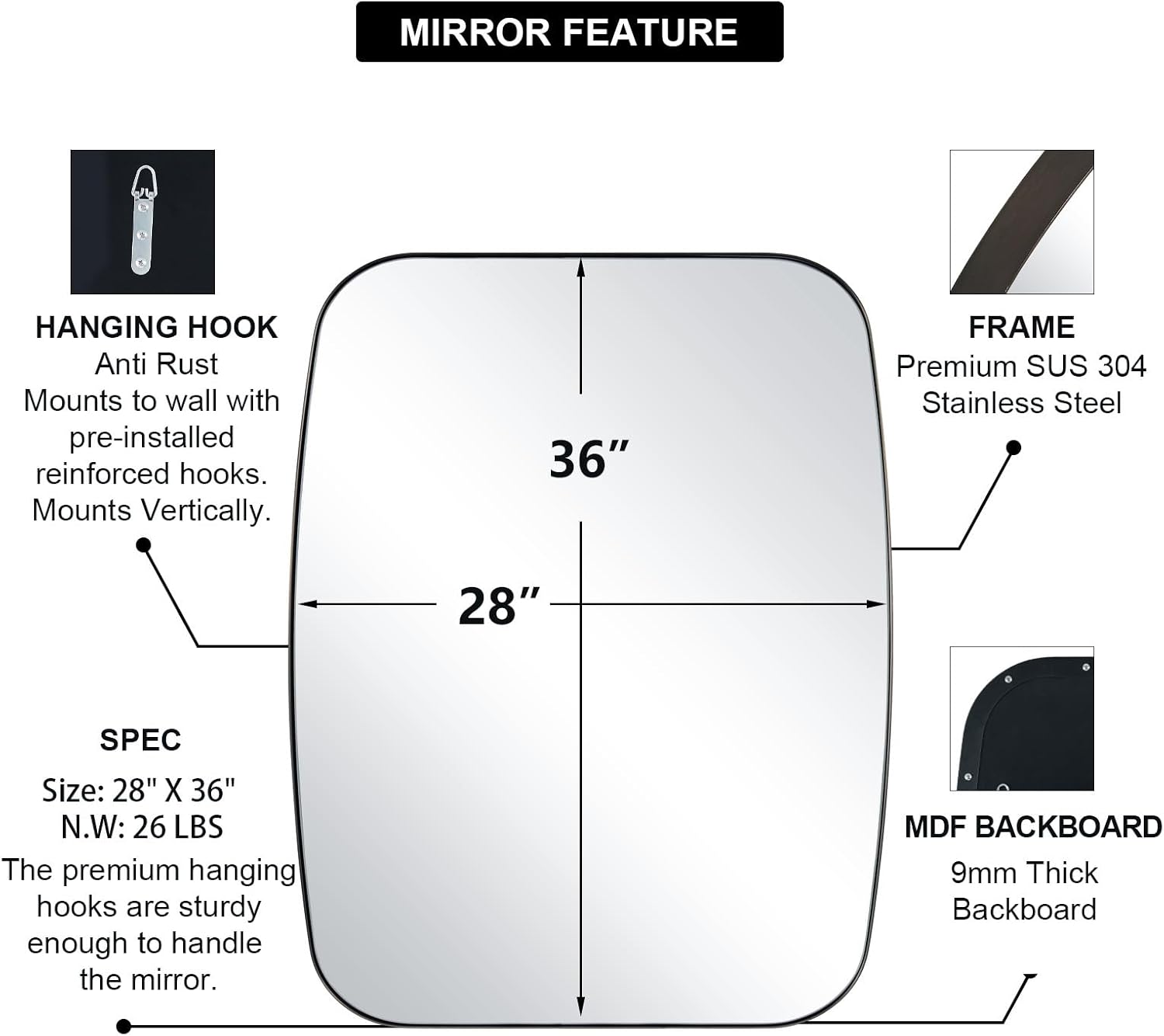 - Versatile Design for Medium Spaces: Enhance your medium-sized bathroom with the 28 x 36 inch mirror; balanced proportions and high-quality construction offer versatility; allows for vertical or horizontal installation to suit your style and space needs