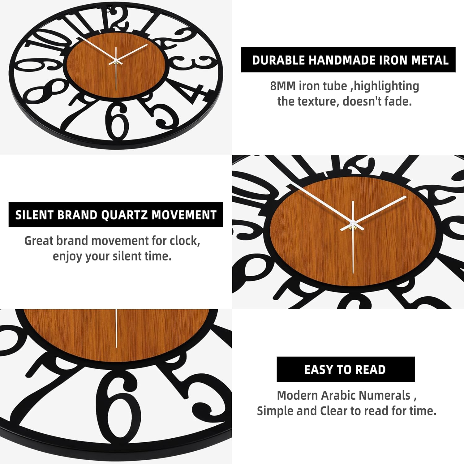 - [Quality Hndmade Clock] -The large black metal clock has a wood face-out retro design. The strength and retro appearance of the Big Number wall clock are ensured by the use of high-quality 2cm thicker handmade iron materials in the handcrafted, metal frame and showing the wooden face.