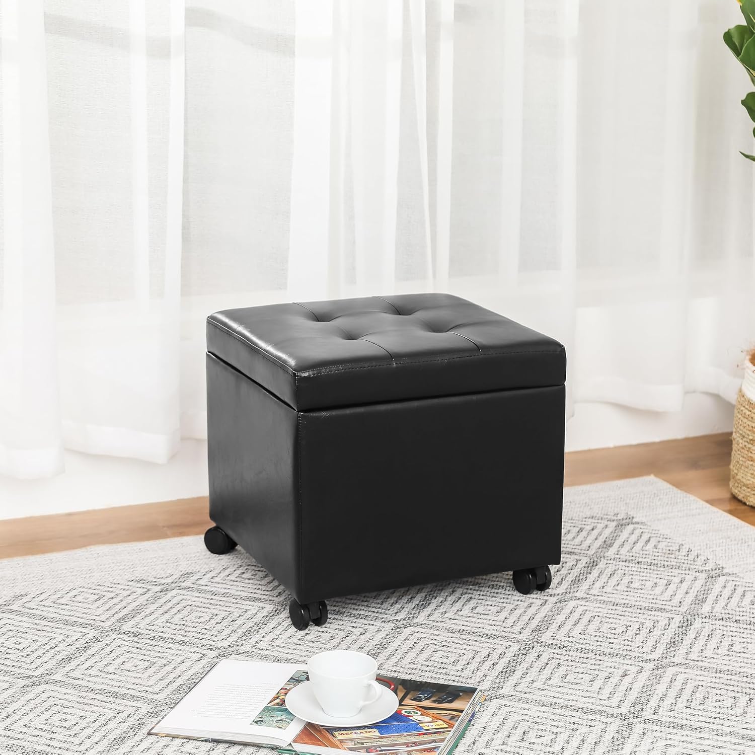 Adeco 17.7" Leather Ottoman with Wheels, Black Square Rolling Ottoman with Storage, Upholstered Button Tufted Vanity Stool with Hinged Lid for Living Room, Bedroom, Dorm