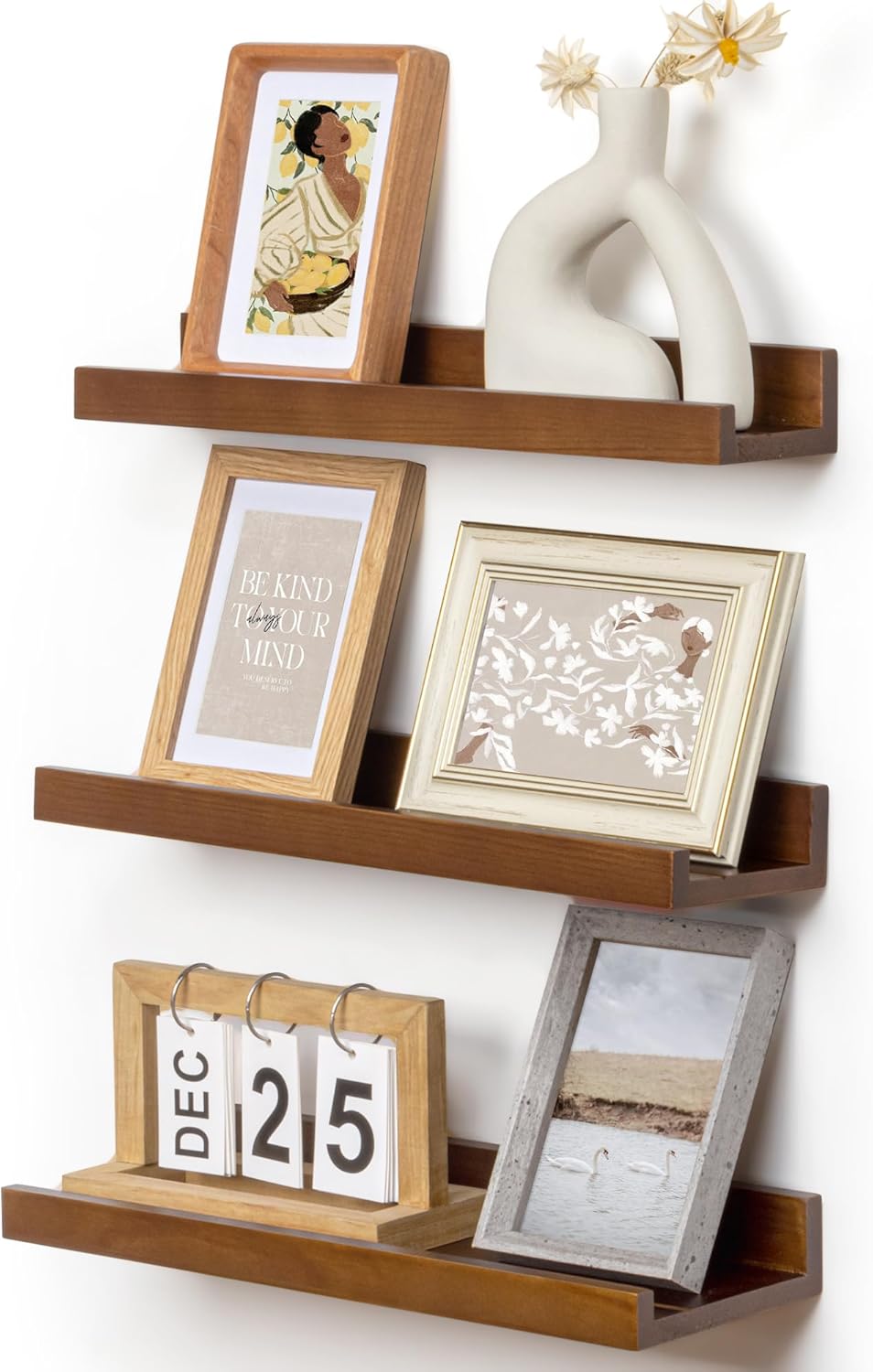 Pine Wood Rustic Floating Ledge Shelves Set of 3, 16 inches Width - Solid Pine, Walnut Finish - Kids' Room to Living Room Wall Decor
