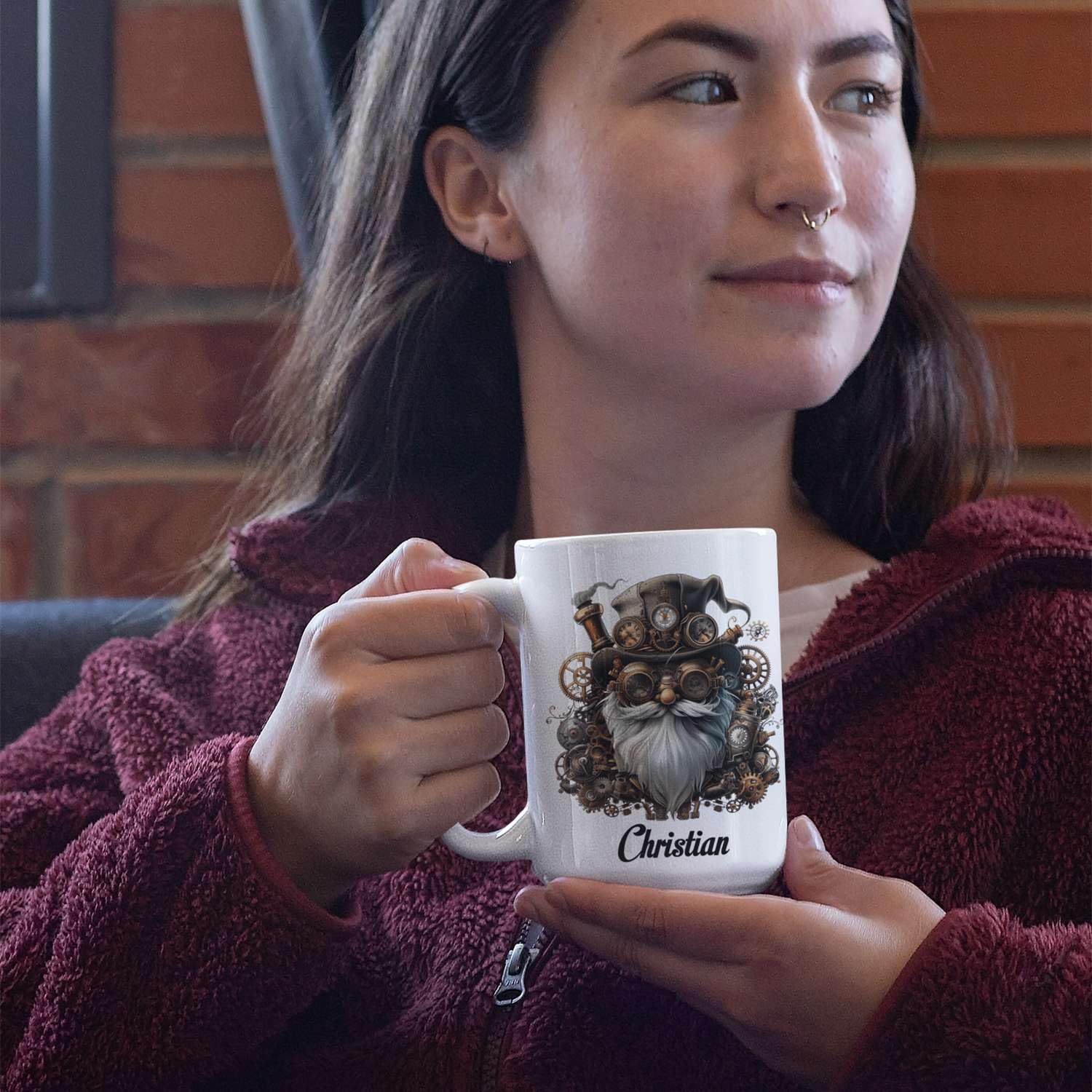 Custom Mechanical Art Mug 15oz, Personalized Steampunk Gnome Coffee Mug, Customized Name Ceramic Cup, Fantasy Enthusiasts Mug, Gnome White Mug With Steampunk Themed, Gift For Men