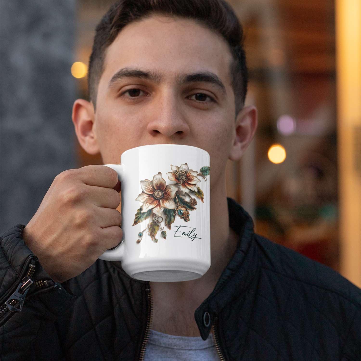 Customized Name Coffee Cup, Custom Steampunk Floral Design Cup, Personalized Flower Lover Ceramic Cup 11oz, White Mug Gift For Floral Enthusiasts, Steampunk Flower Cup For Birthday