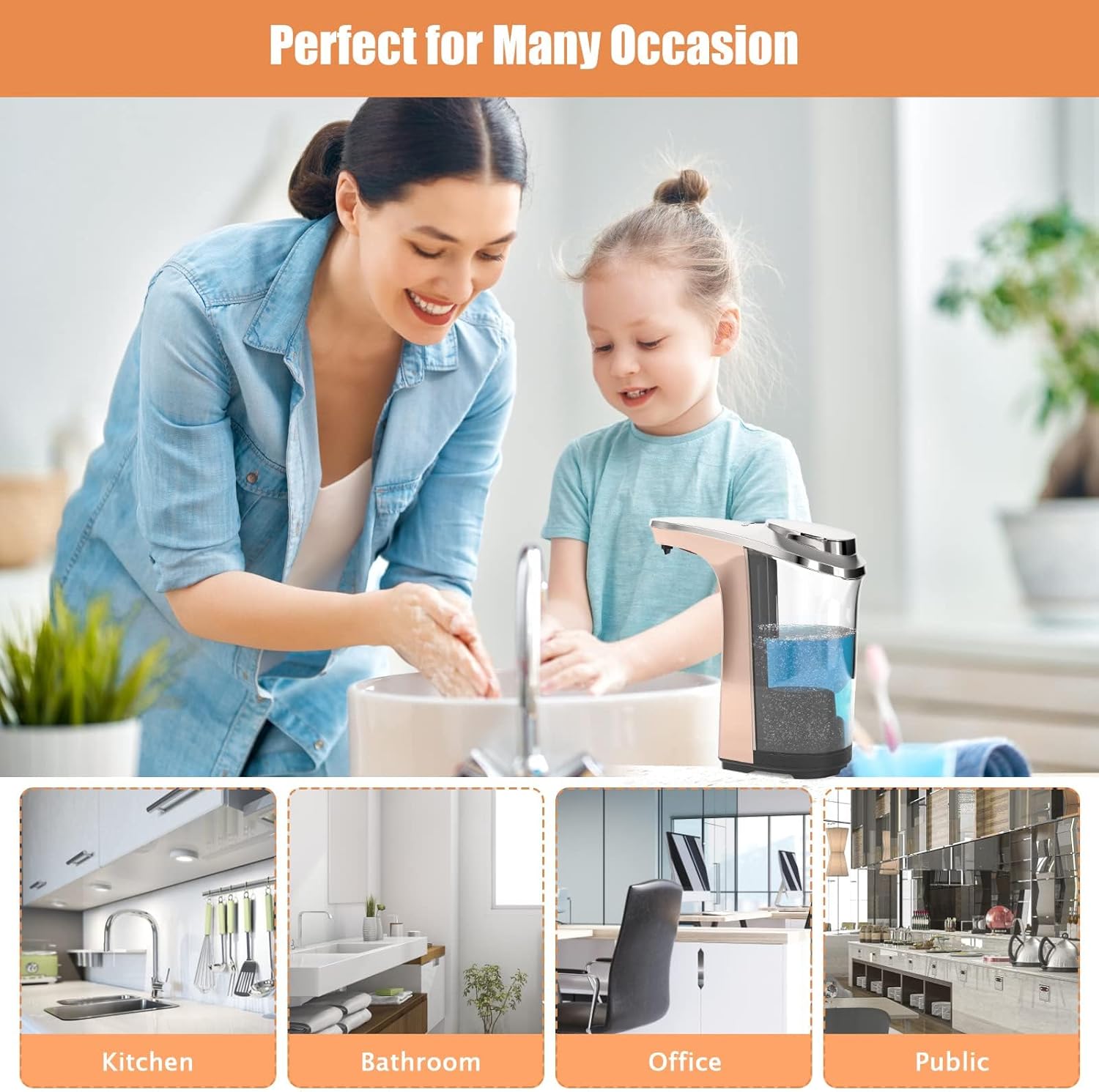 - [Wide Compatibility Soap Dispenser] This touchless soap dispenser operates on 4 AA Alkaline batteries (not included), which can be used in any occasion without limits on the power outlet. Suitable for multiple occasions, such as home, hotel, school, office, and other places. We will provide 2-year quality assurance and lifetime professional service, please reach out to us if any help is in need.