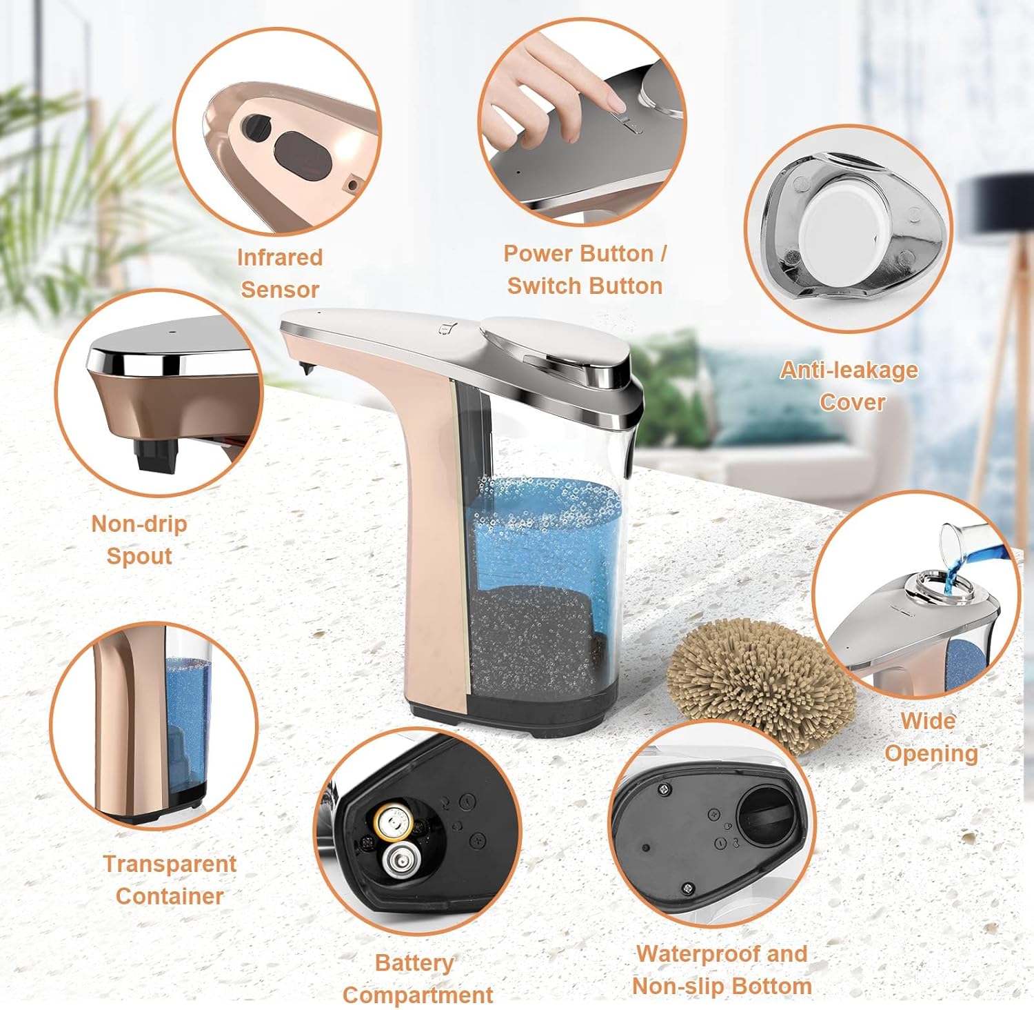 - [Sleek, Waterproof & Leak-proof Design] Designed with high-quality and shiny non-rust brushed aluminum, this kitchen soap dispenser is attractive and durable, easy to clean. The soap dispenser also comes with leak-proof and IPX4 waterproof technology to prevent soap or water from corroding circuit boards. Non-slip base with a high sealing rubber ring enhances its durability and waterproof performance.