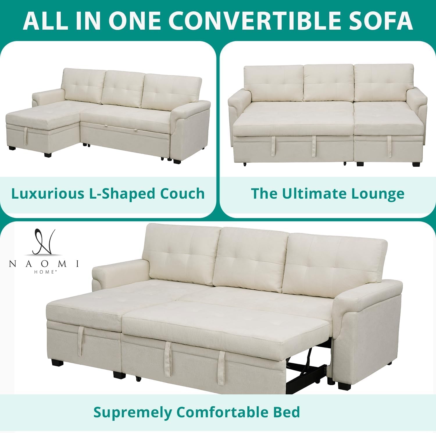 Naomi Home L-Shaped Reversible Sectional Sofa with Pull-Out Sleeper Bed and Storage Chaise, Cream Velvet