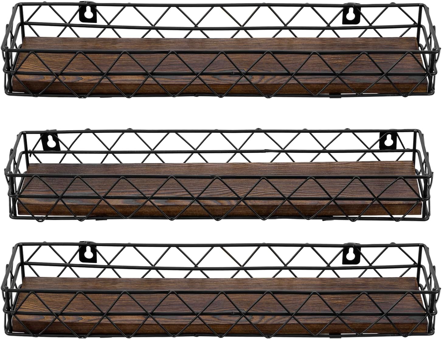 - Set of 3 burnt solid wood and geometric black metal wire wall mounted kitchen racks organize spices while adding a touch of modern rustic décor