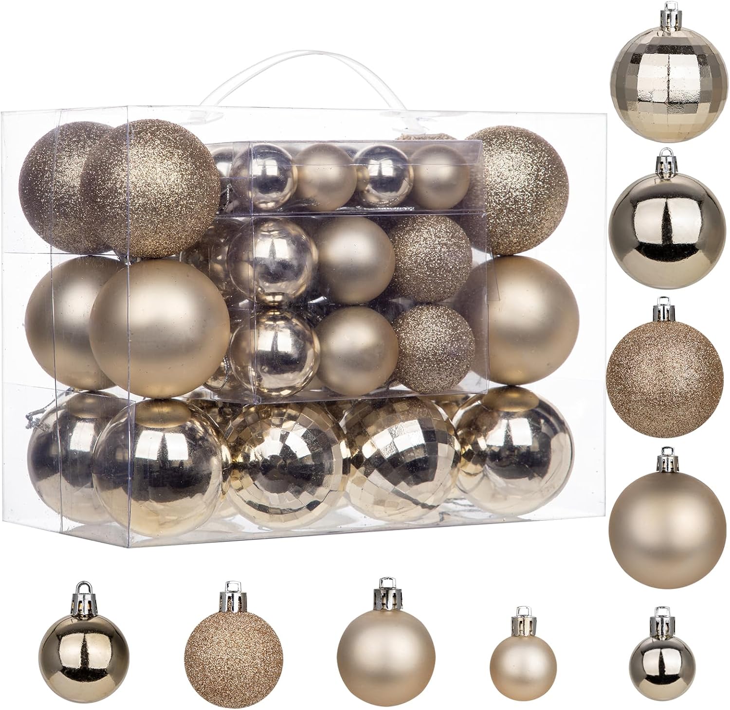 - Easy to Use: Each hanging champagne Christmas ball ornament equips a hook with string for you to hang it easily. Perfect fit for any normal size tree, give yourself a perfect space, hang anywhere you like. Such as tree branches, gate, fence, banister, etc. Create a warm and harmonious atmosphere