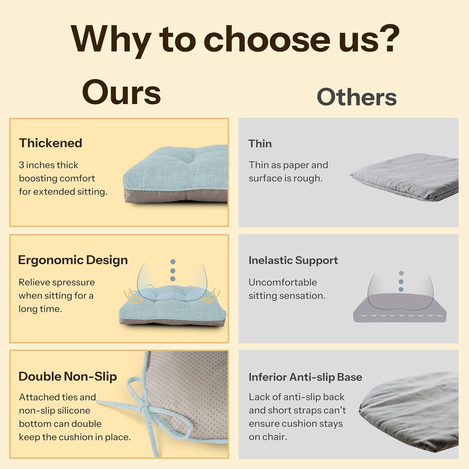 - Non-Slip Design: Designed with 33cm/13-inch straps and a non-slip backing, these chair pads won't slip or slide off your chair. They're easy to attach and non slip silicone bottom can prevent the dining room chair cushions from sliding around.