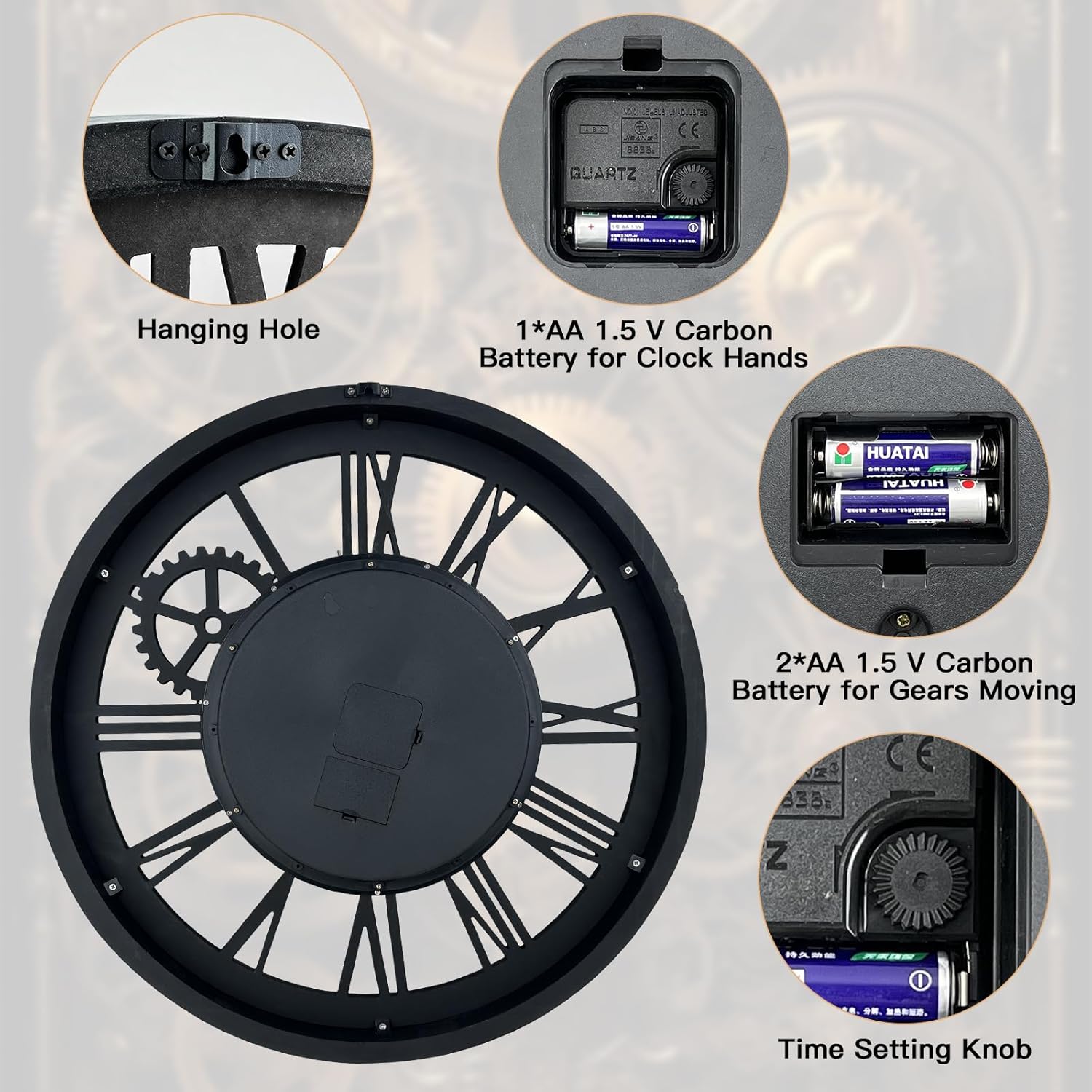 - REAL MOVING GEARS: Large wall clock with unique moving parts is as attractive as it is functional. Put batteries in, various gears start rotating fluently. Moving gear wall clock is amazing looking on the wall and will get so many compliments on it. Made from solid wood and painted by Rust-like color on wall clock create a very rustic and industrial atmosphere. Farmhouse wall clock is professionally handmade and pursuit of naturalness, so it may have some little imperfections.
