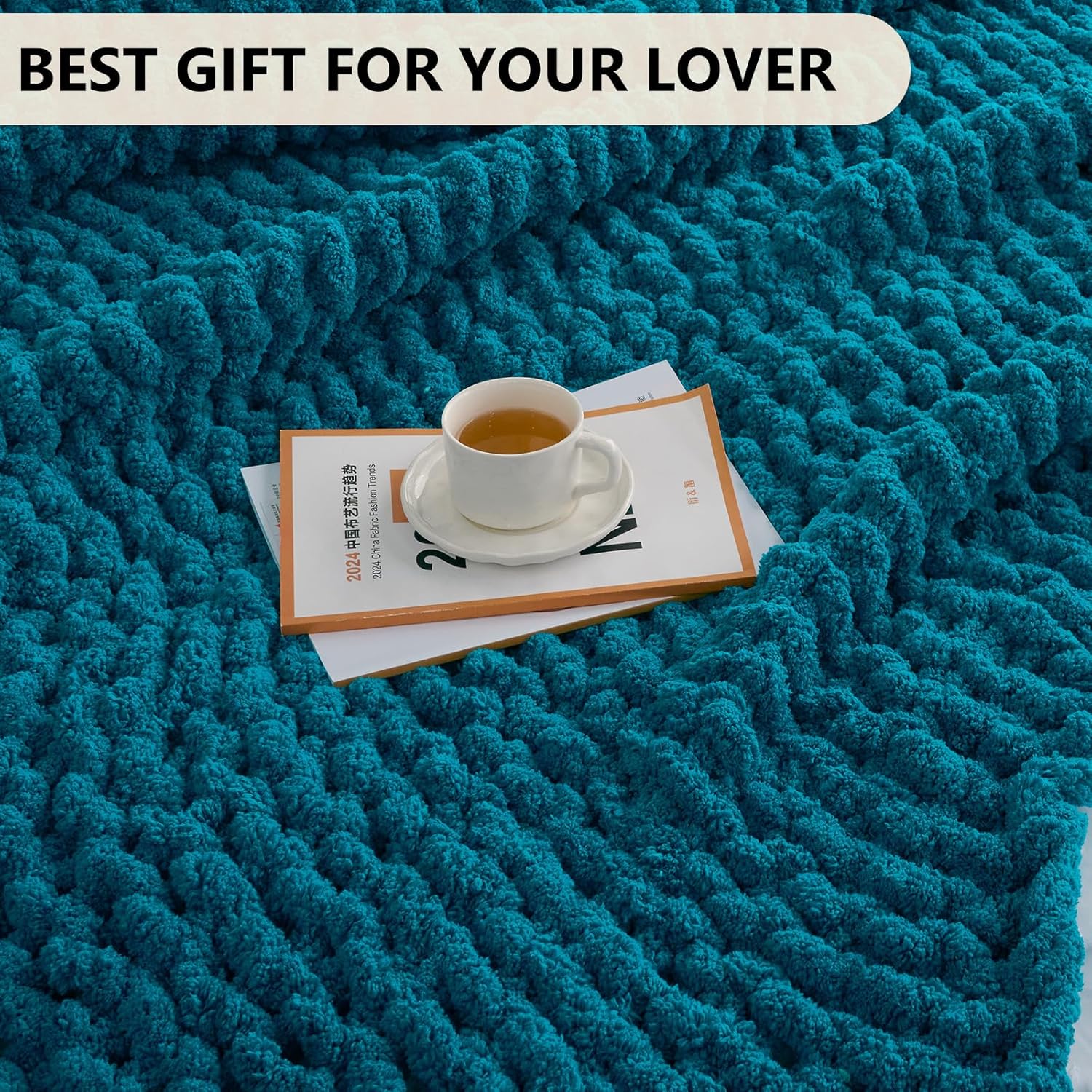 L'AGRATY Chunky Knit Blanket Throw: 60''x80'' Chenille Chunky Knitted Throw Blanket for Bed Couch - Handmade Thick Big Cable Knit Blanket - Large Crochet Rope Blanket for Home Decor(Teal)