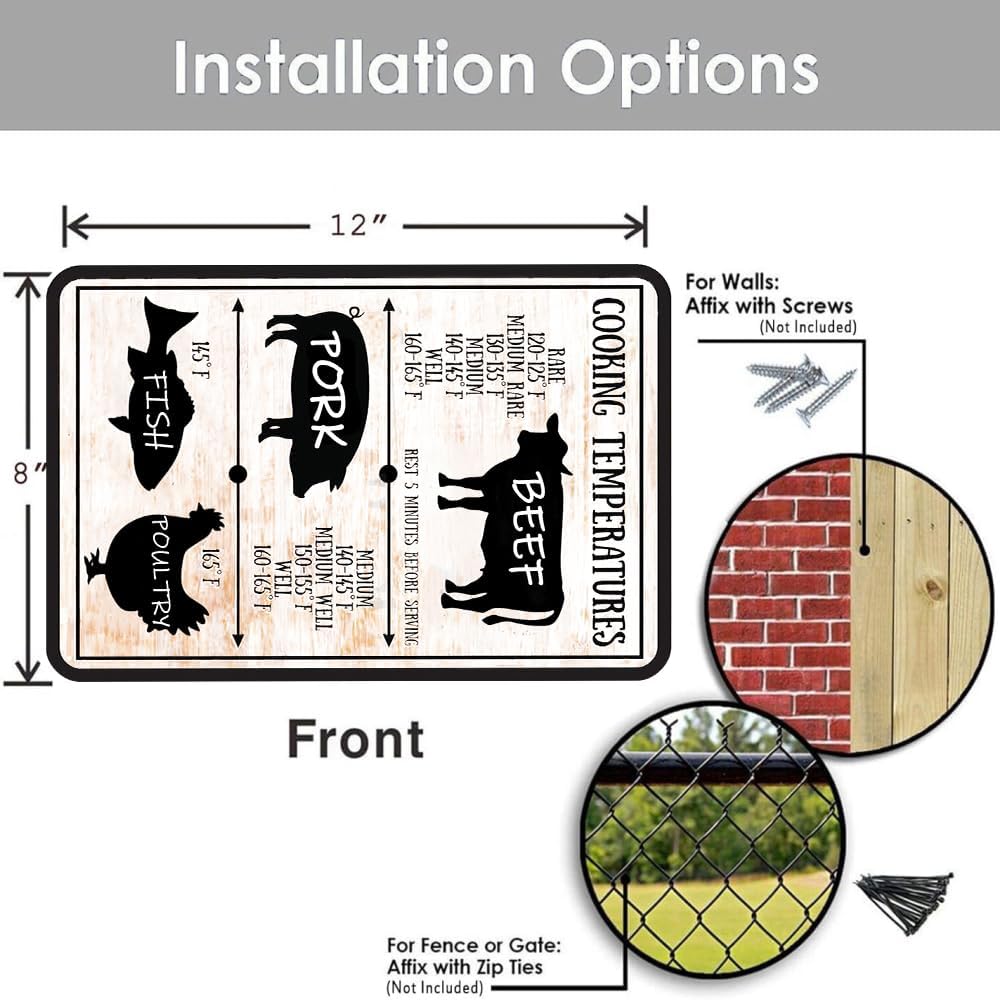 - Kitchen Tin Sign Easy To Hang: Funny Metal Tin Sign Cooking Temperatures Sign Decorations. Each Comes With 4 Pre-Drilled Holes So You Can Install Them Right Away. Just Nail It, Stick It With A Command Bar, Or Hang It With A String (Installation Tools Not Included). Plus, Rolled Edges And Rounded Corners Keep You Safe. These Signs Are Sure To Add Character And Style