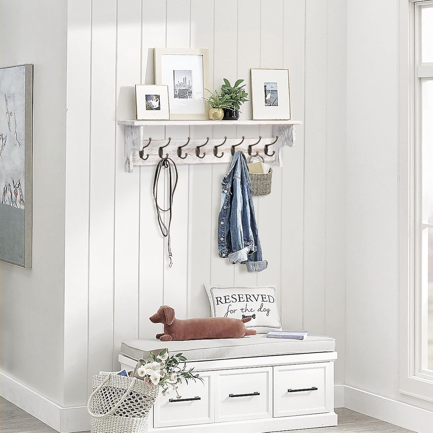 - Easy to Install: This coat rack wall mount with shelf is assembled, 8 metal hooks pre-installed, very easy to install on the wall, wall coat rack's packaging with detailed installation instructions and accessories, your installation will be very easy