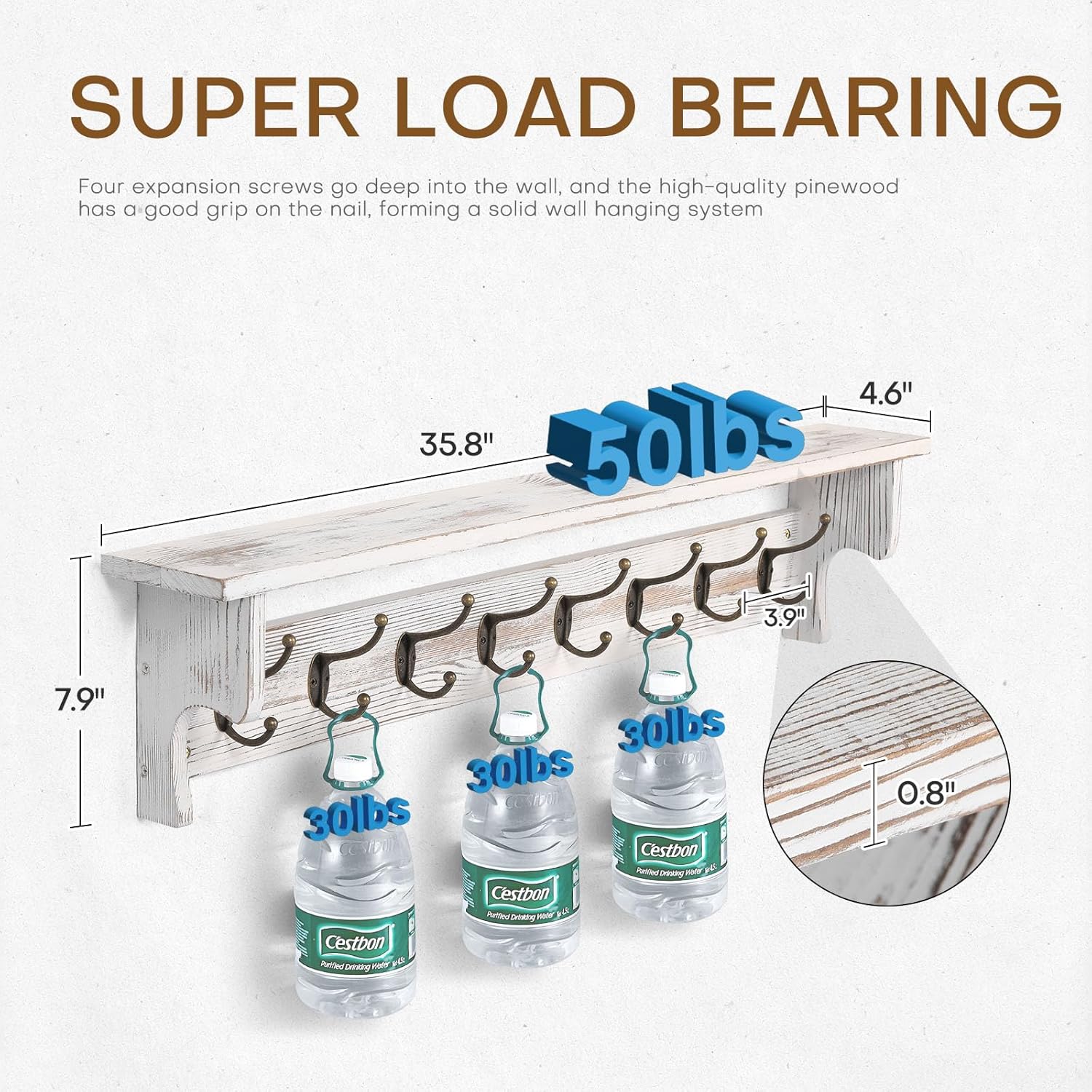 - Retro Design with Large Size: With a rustic retro feel, this wooden wall coat rack with hooks can easily be adapted to a variety of home styles. The wall coat rack measures 35.8 "L x 4.6" W x 7.8 "H and can hold up to 120 pounds