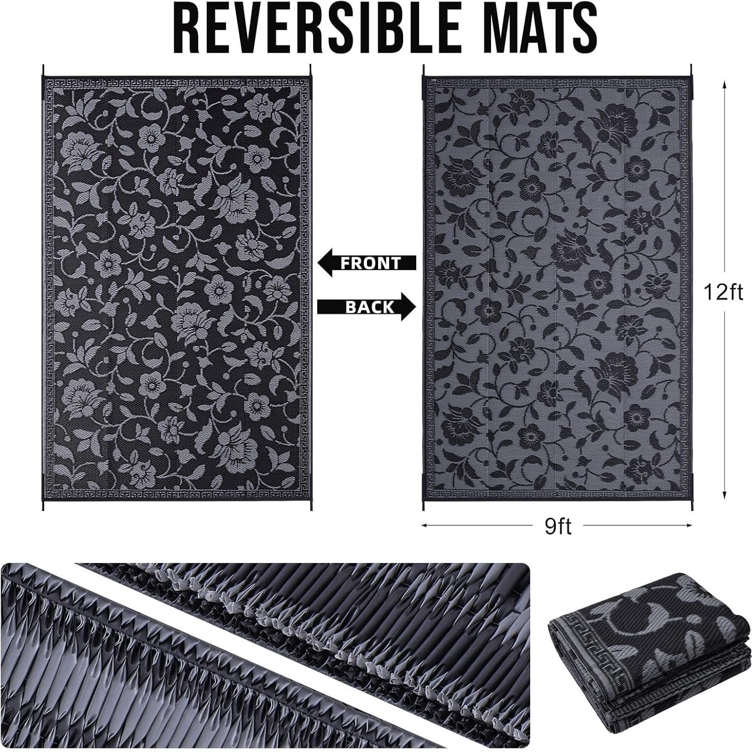 OLANLY Waterproof Outdoor Rug 9x12 ft, Outdoor Plastic Straw Rug with Flower Pattern, Reversible RV Mat for Patio, Camping, Balcony, Deck, Backyard, Black & Grey